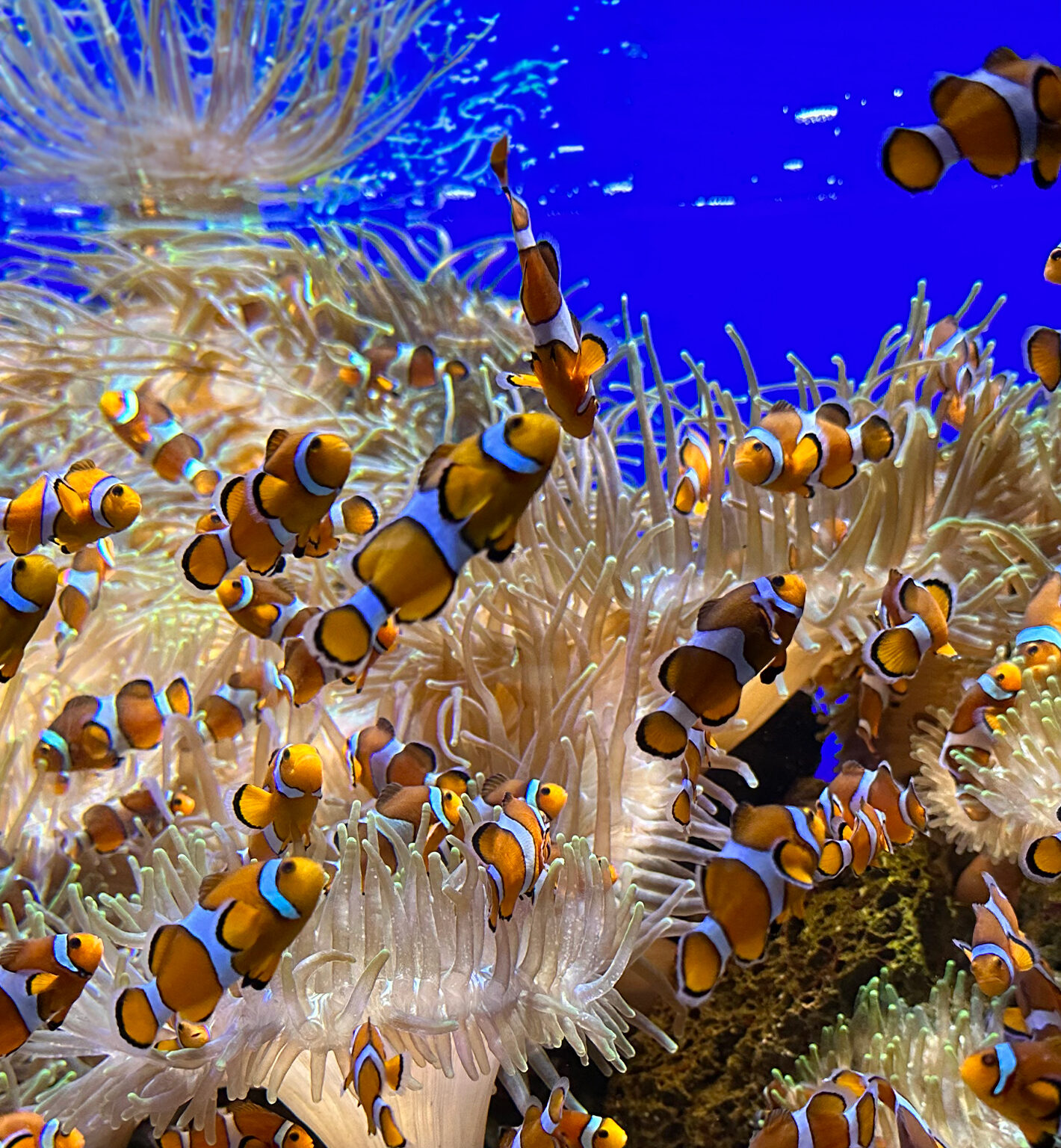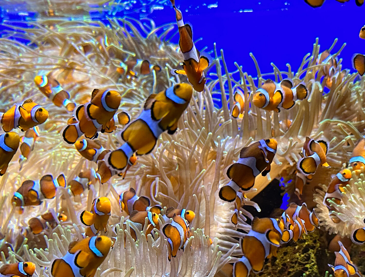 Numerous clownfish swim within a large sea anemone, filling the frame with orange and white patterns. The deep blue water creates a stark co…