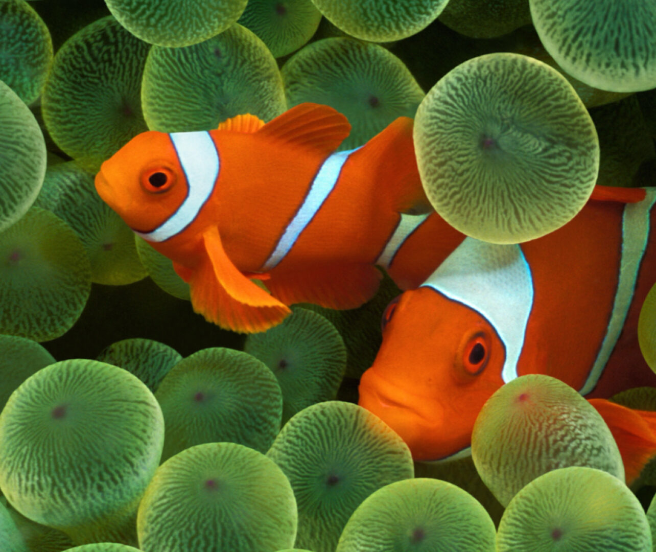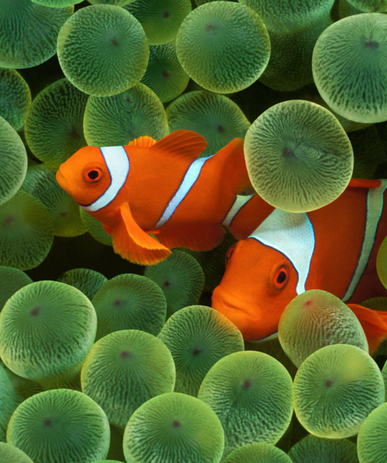 Two orange clownfish swim within a dense field of rounded, green coral formations. The shallow depth of field creates a soft focus on the co