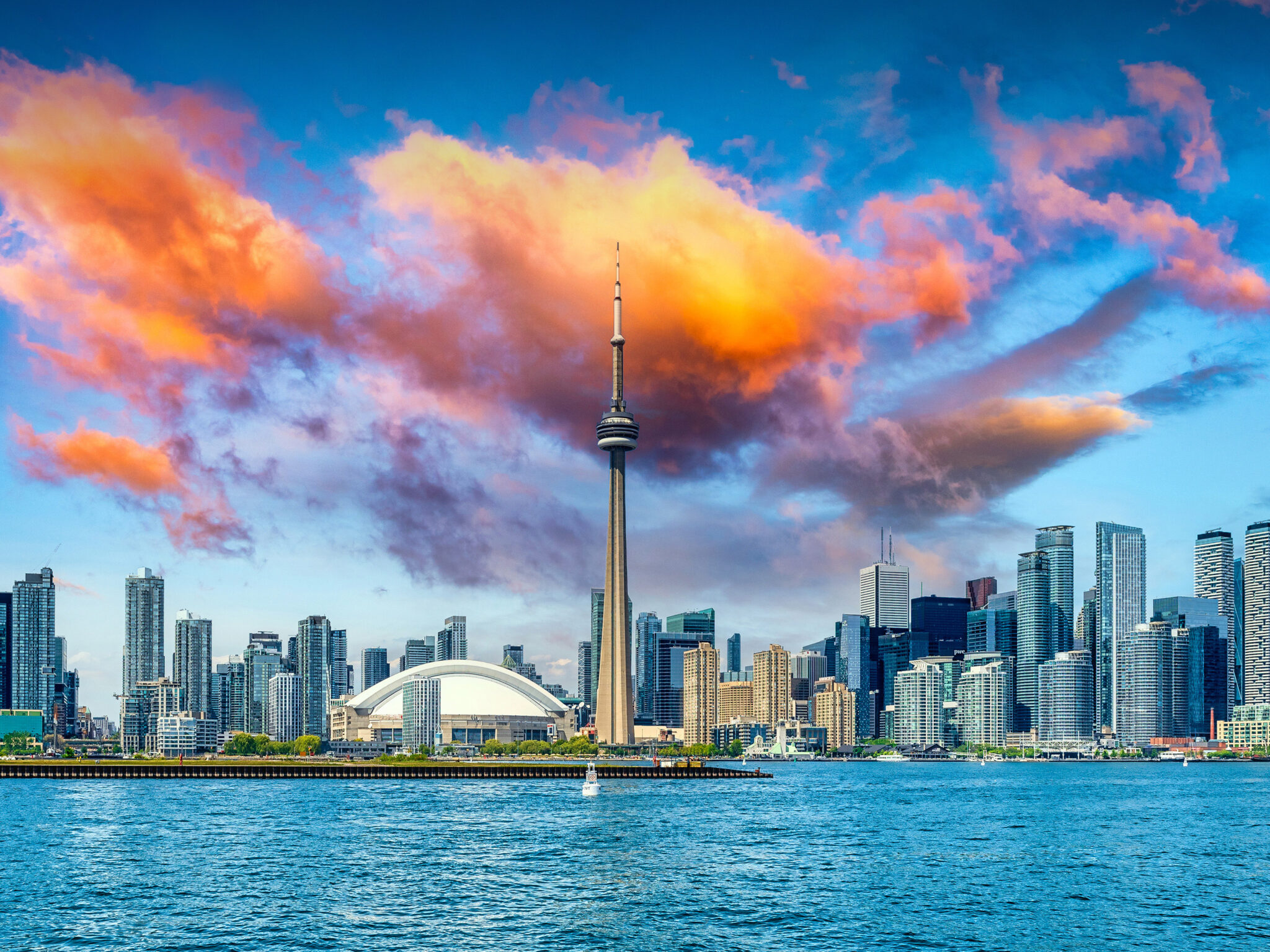 Toronto's skyline looking gorgeous here with the CN Tower standing tall against these wild orange and pink sunset clouds over the deep blue