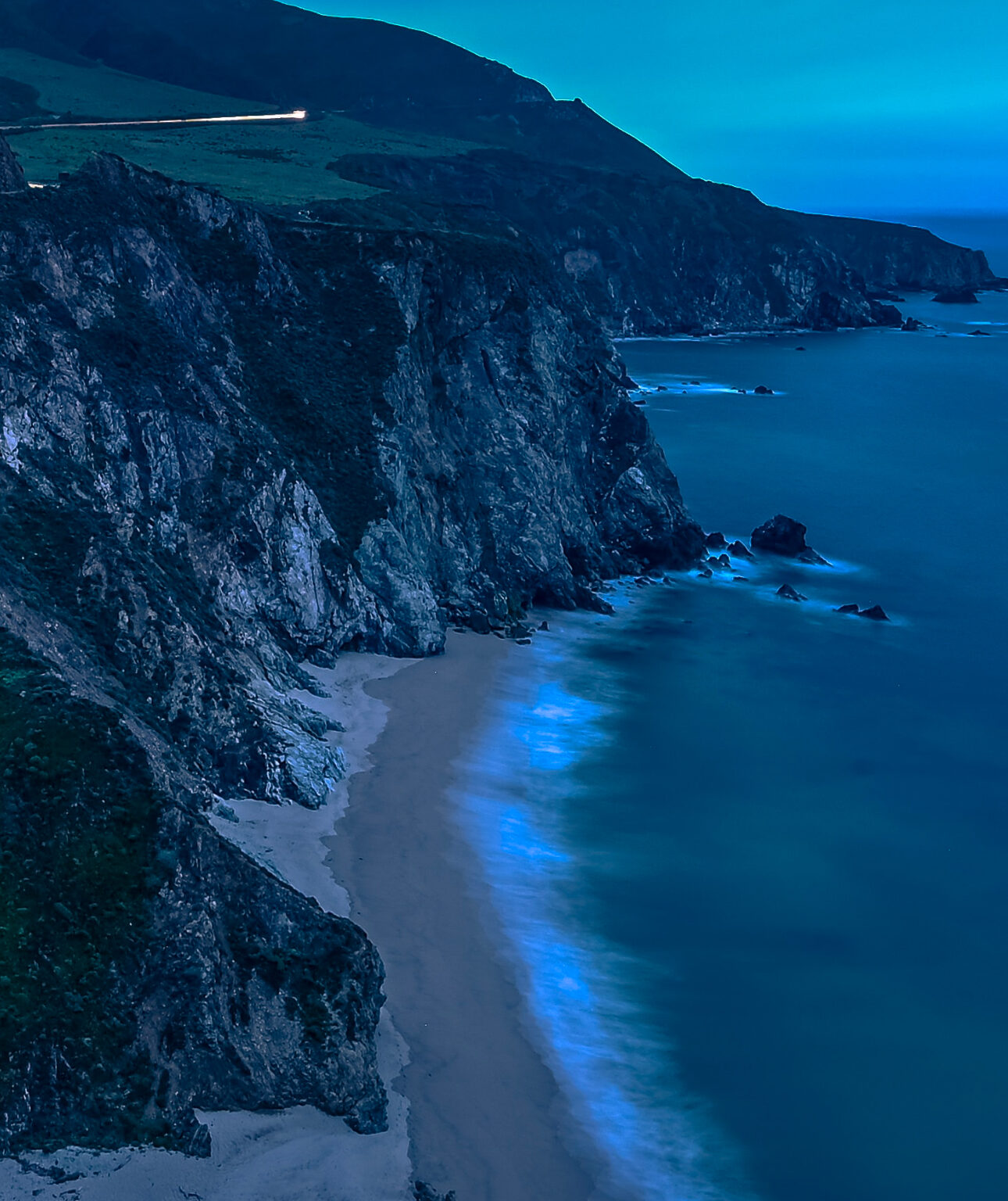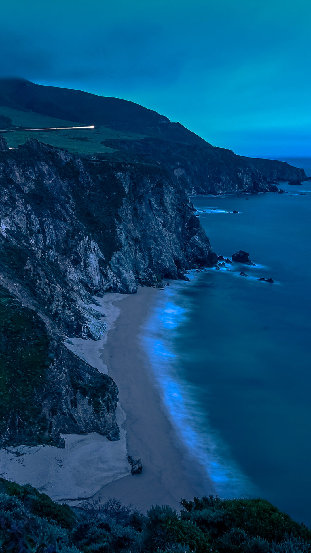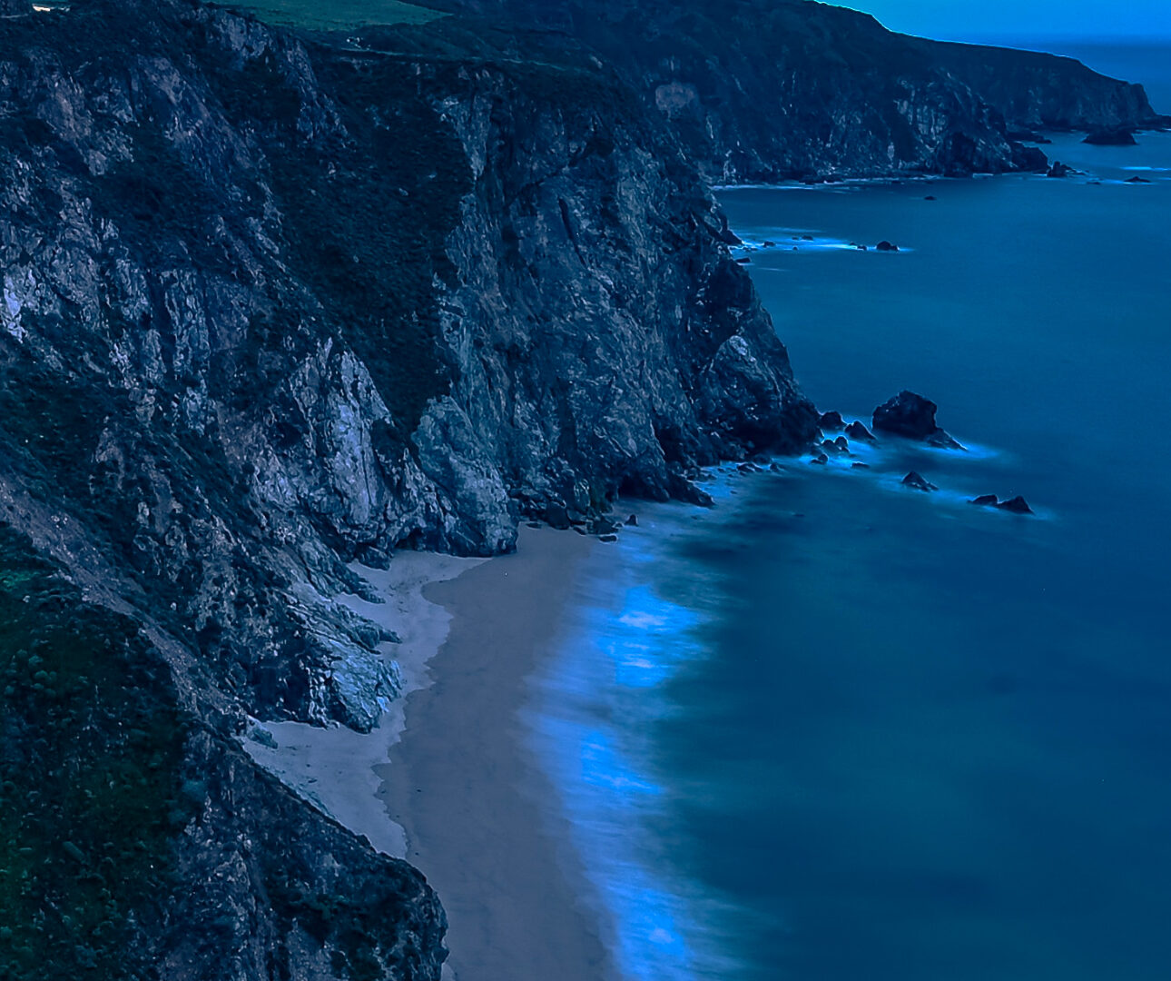 A steep cliff descends to a sandy beach alongside a dark blue ocean. Bright turquoise waves illuminate the shoreline with a soft glow in the twilight.