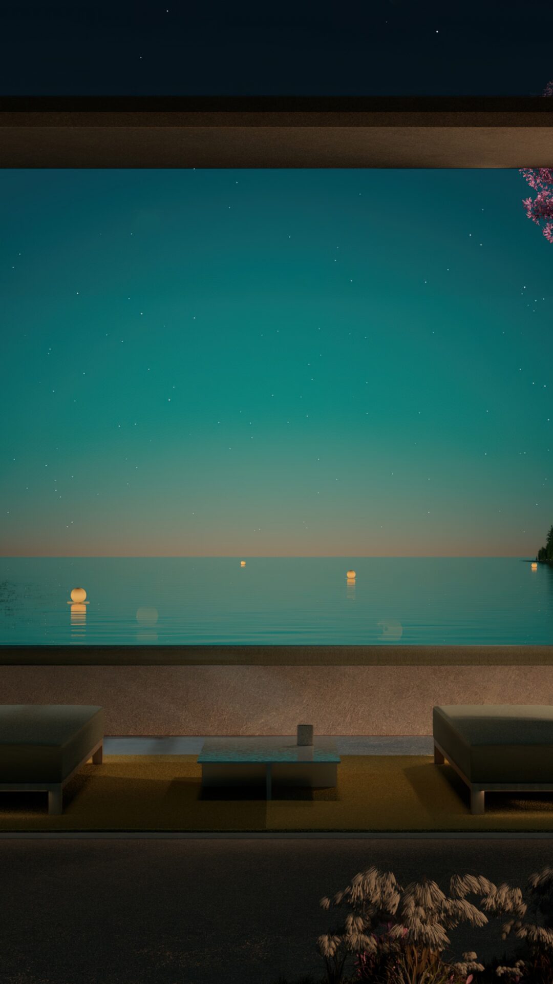 A patio overlooks a calm body of water under a night sky. Soft pink flowers cascade from the columns and contrast with the cool teal and dar