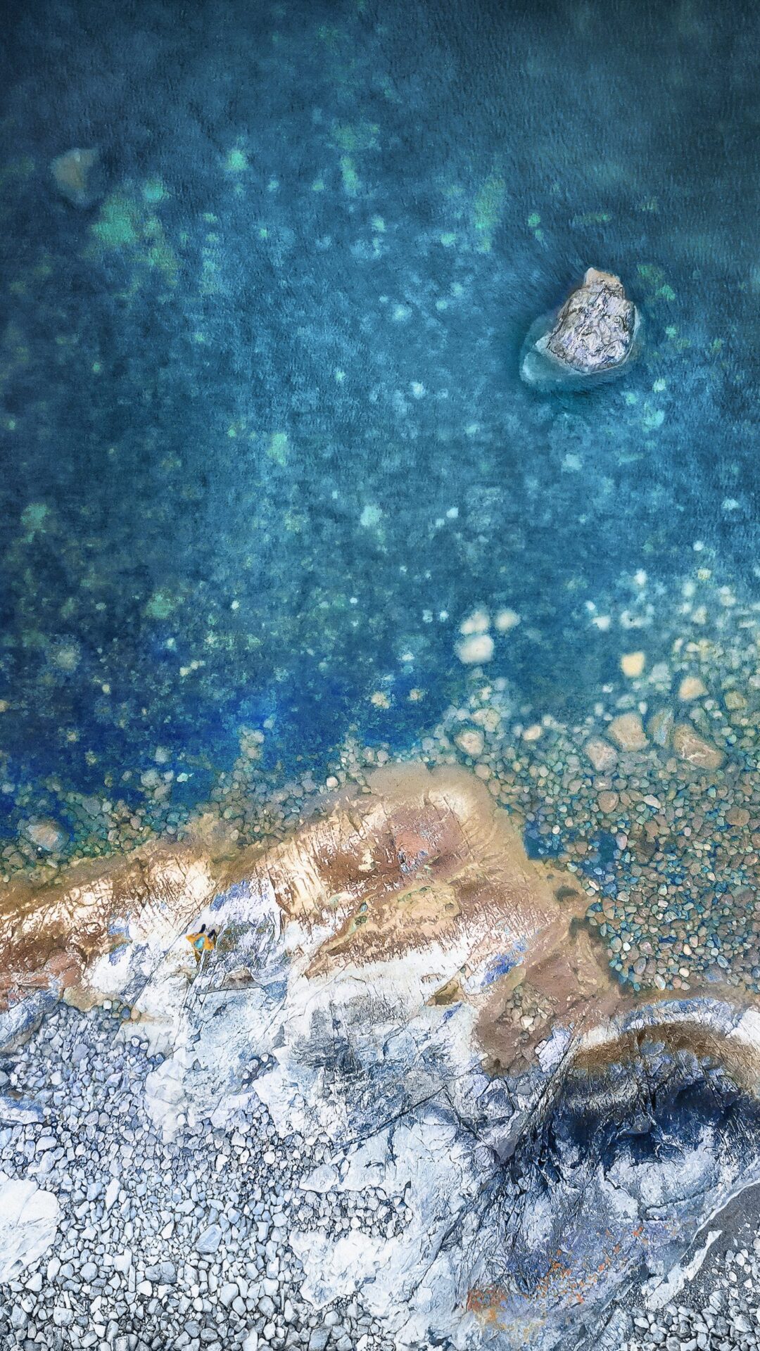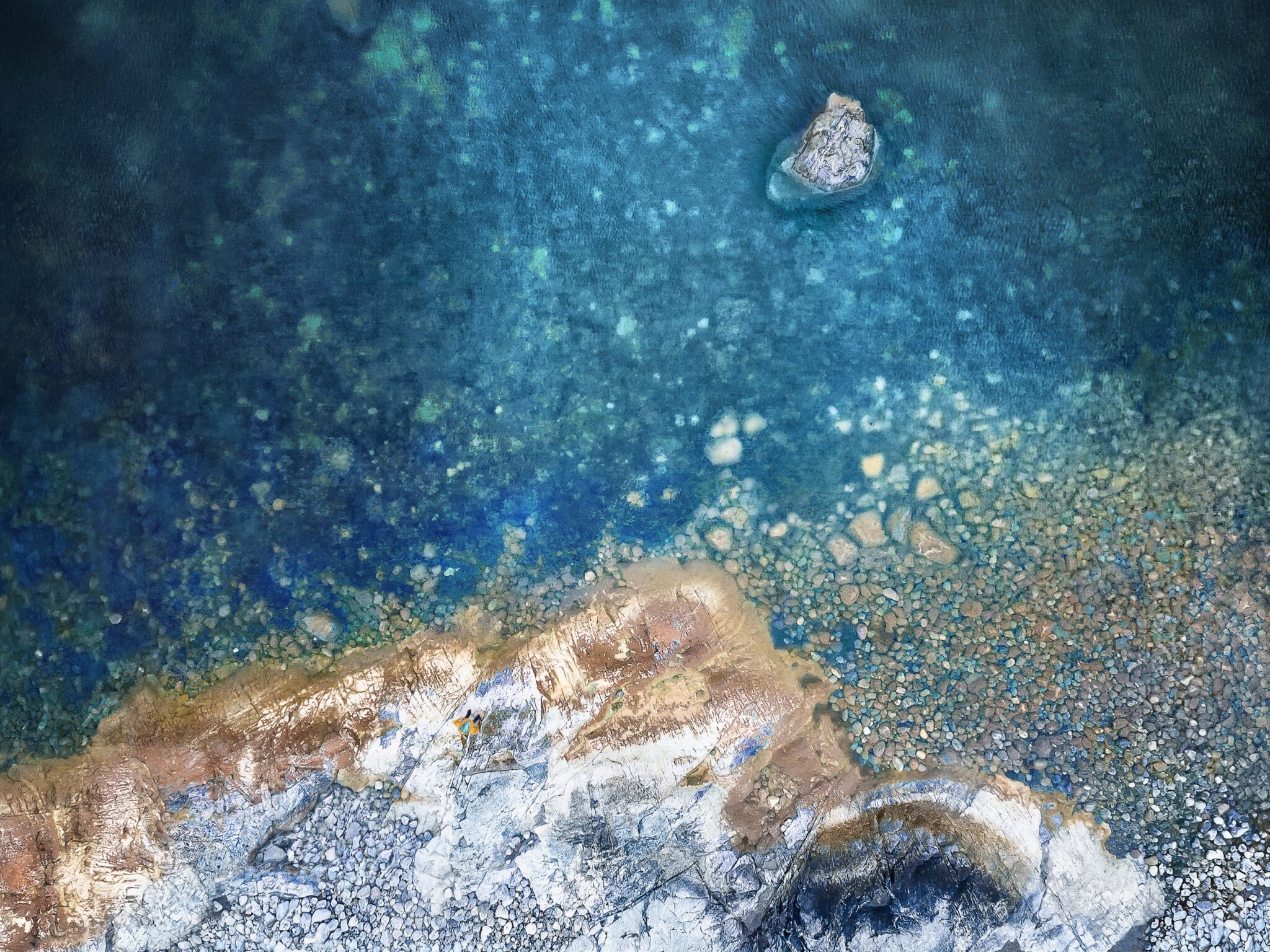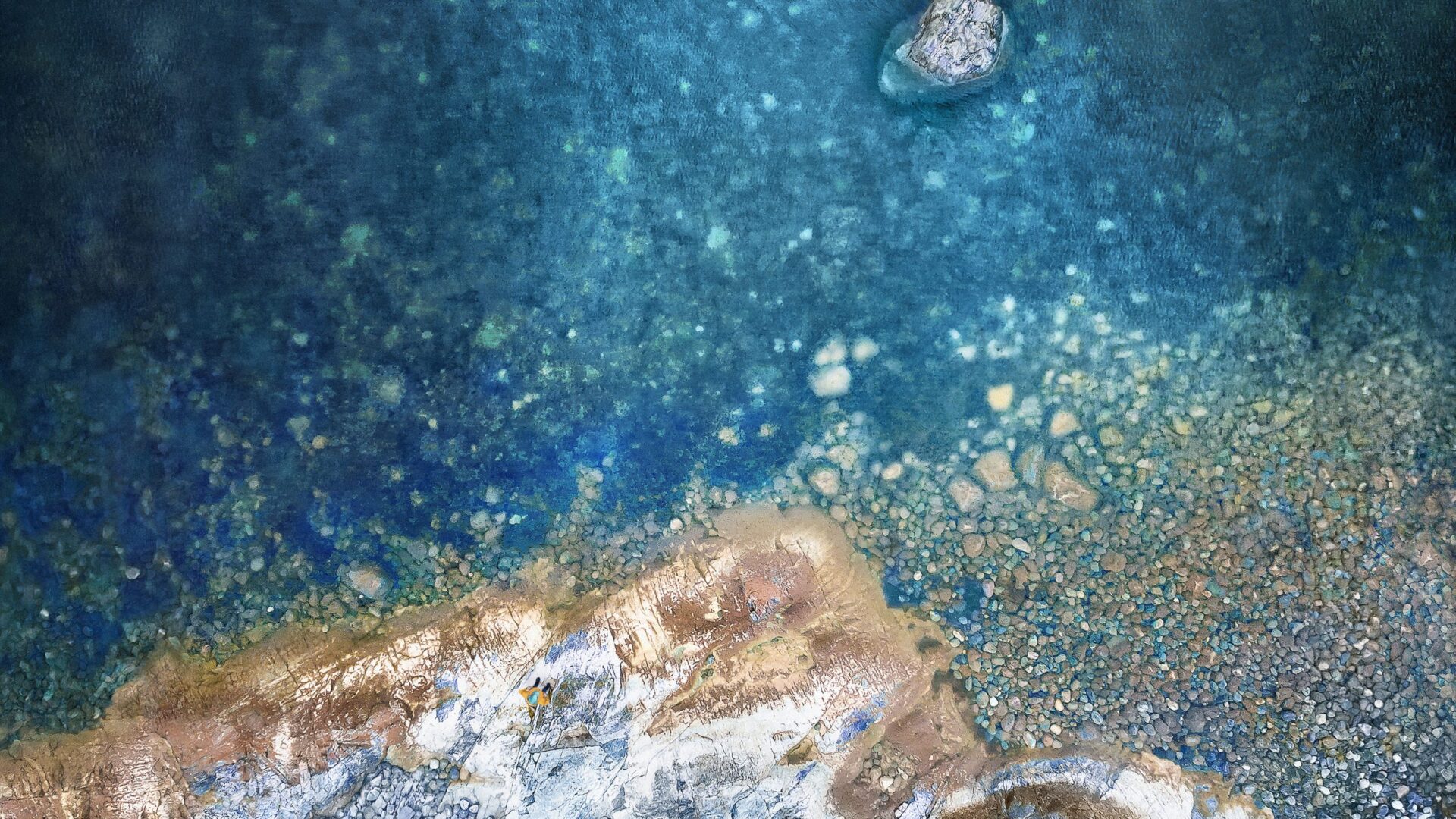 An overhead view shows rocky coastline meeting turquoise water with a small island. Sunlight illuminates the textured rocks and pebbles alon…
