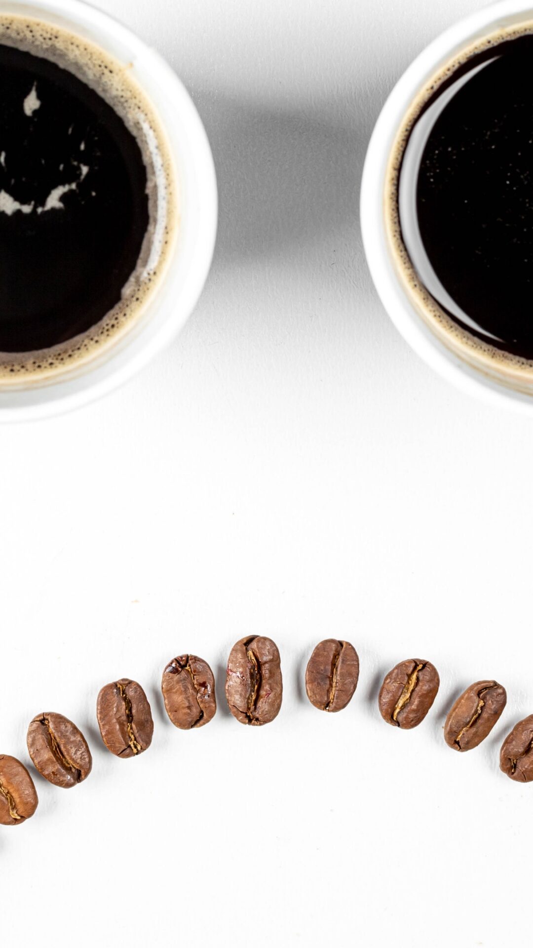 Two cups of dark coffee sit above a curved line of roasted coffee beans. The arrangement is on a clean white surface, creating a simple, fla…