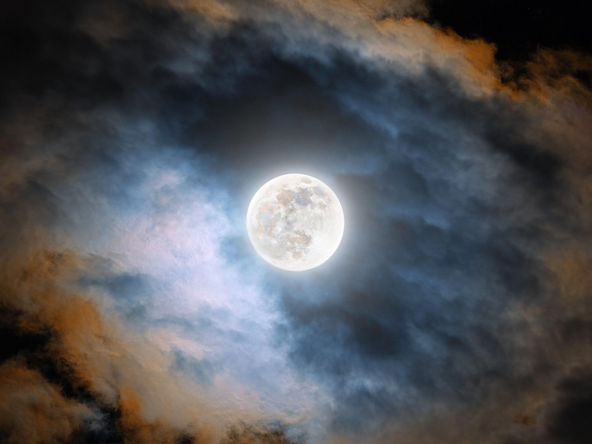 Bright full moon shines through dramatic clouds painted in deep blues, soft oranges, and glowing whites against the dark night sky. Works beautifully for 4K desktop backgrounds when you want something moody and celestial.