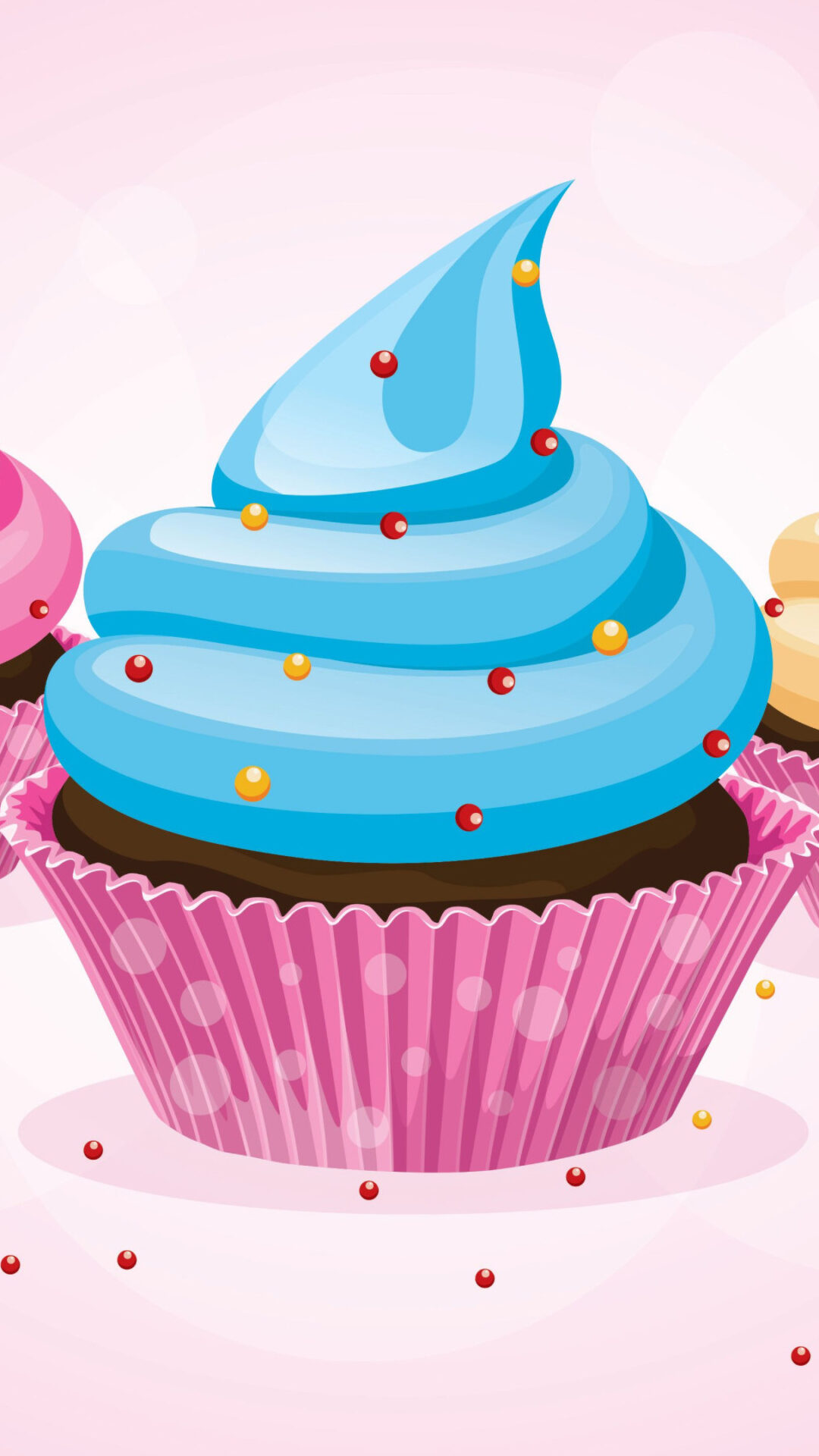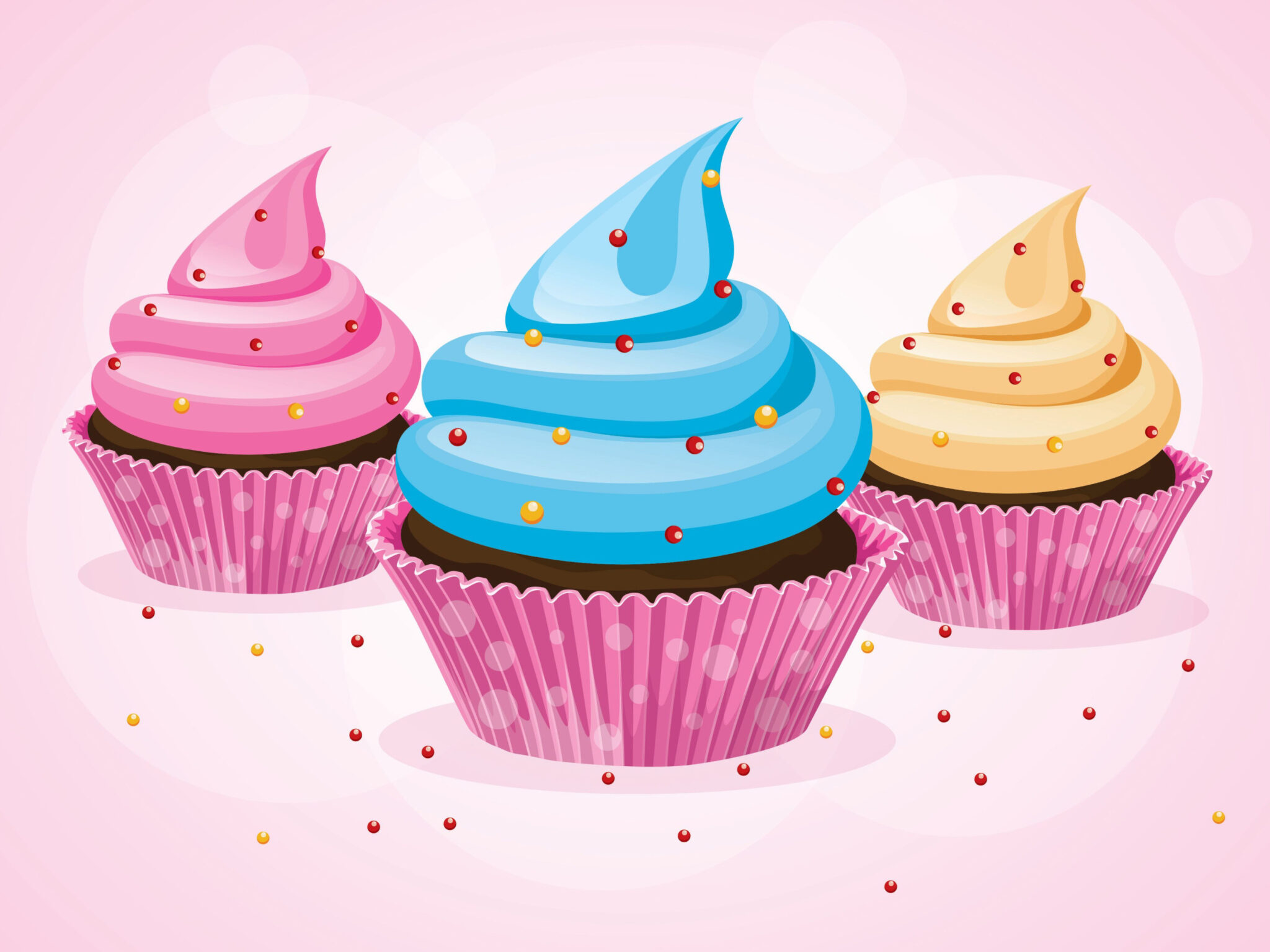 Three cupcakes with pastel frosting are arranged against a light pink background. Small, colorful sprinkles decorate the blue cupcake and ar
