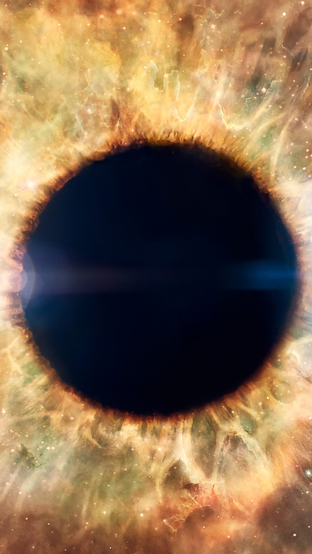 A close-up of a human eye fills the frame, its iris resembling a swirling galaxy. Warm orange and brown tones in the iris contrast with the