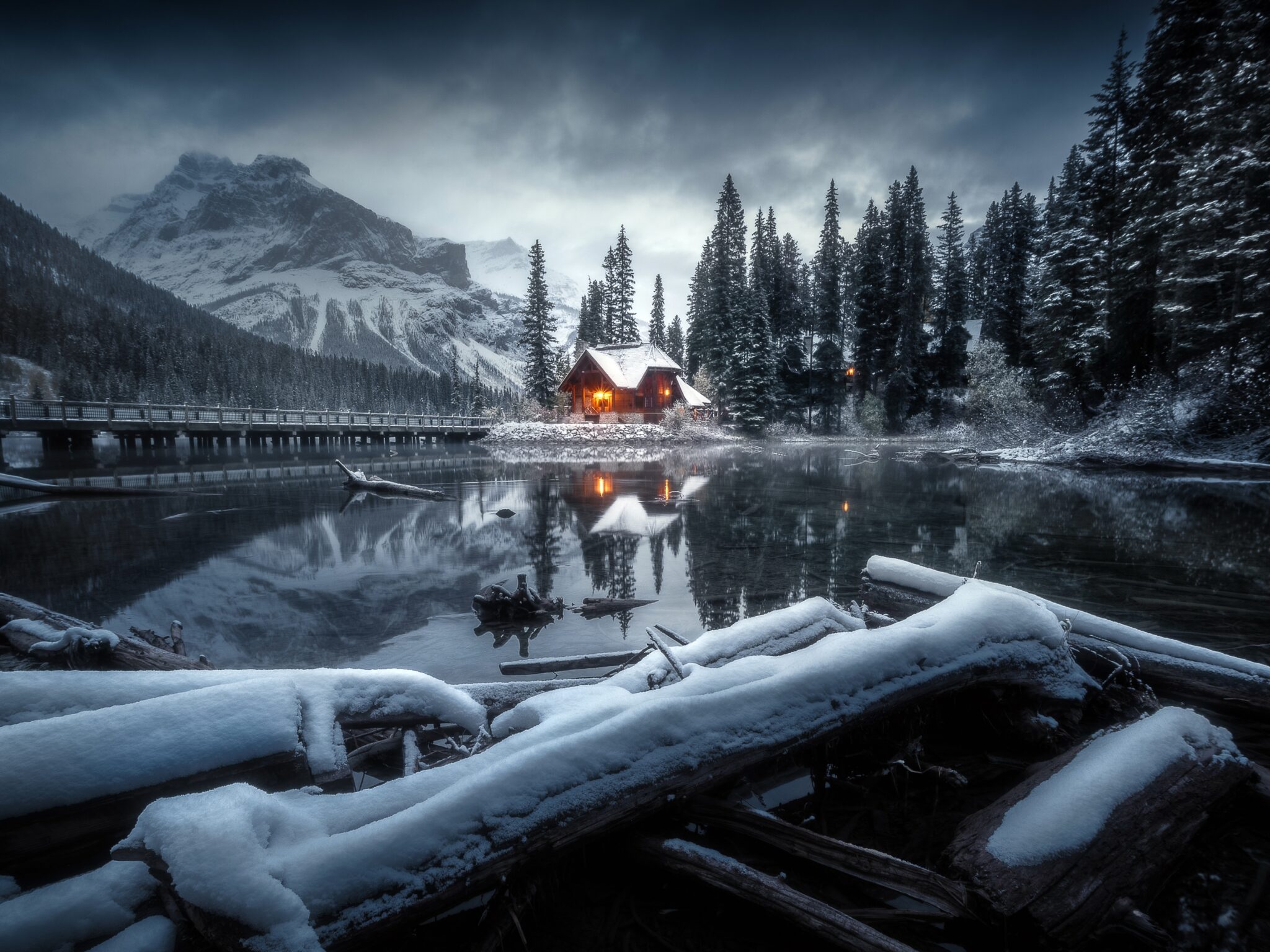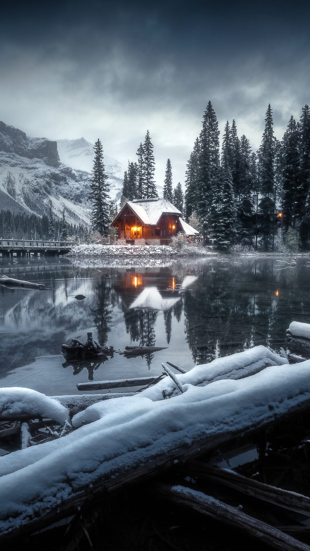 Snow-covered logs frame a warm cabin glowing with orange light across a dark mountain lake, surrounded by frosted evergreens and dramatic pe…