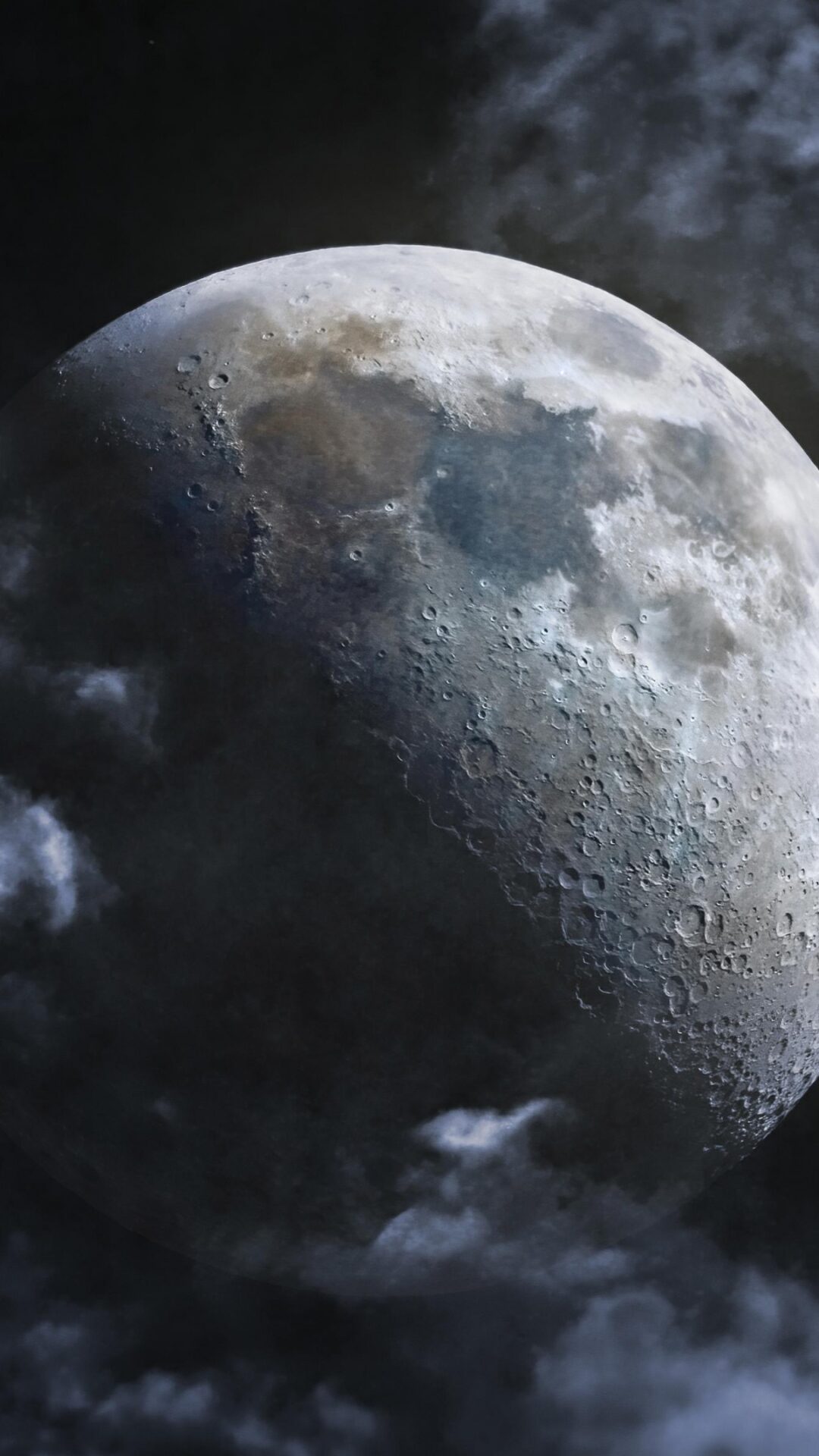 This moody space scene shows a detailed half-moon with visible craters floating among dark blue-gray clouds against a starry black sky. The …