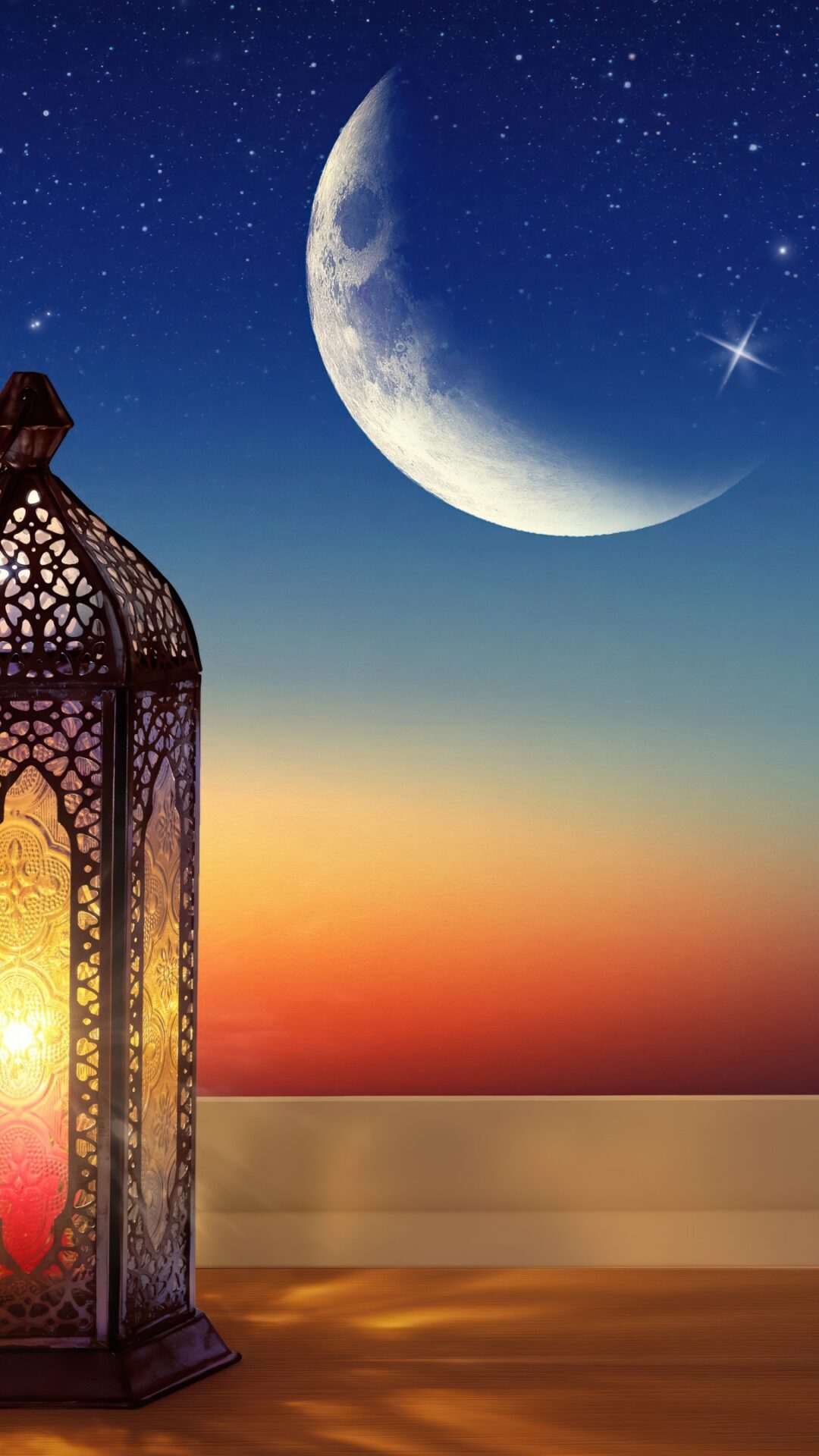 A decorative lantern sits on a surface in front of an open window, looking out to a night sky with a crescent moon. Warm light emanates from