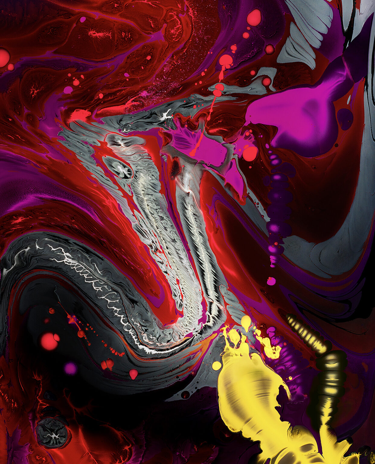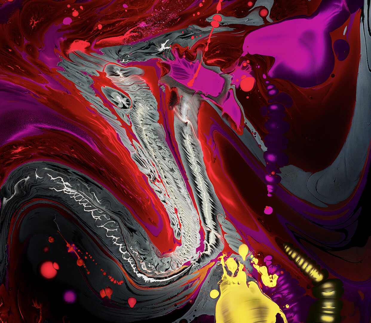 Mixed acrylic paints create an energetic, flowing composition with marbled textures. Bright magenta and yellow accents stand out against darker shades of red, purple, and black.