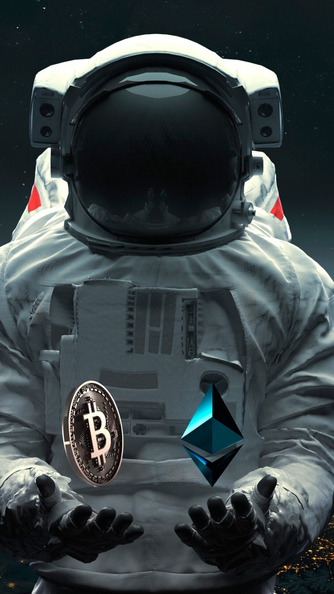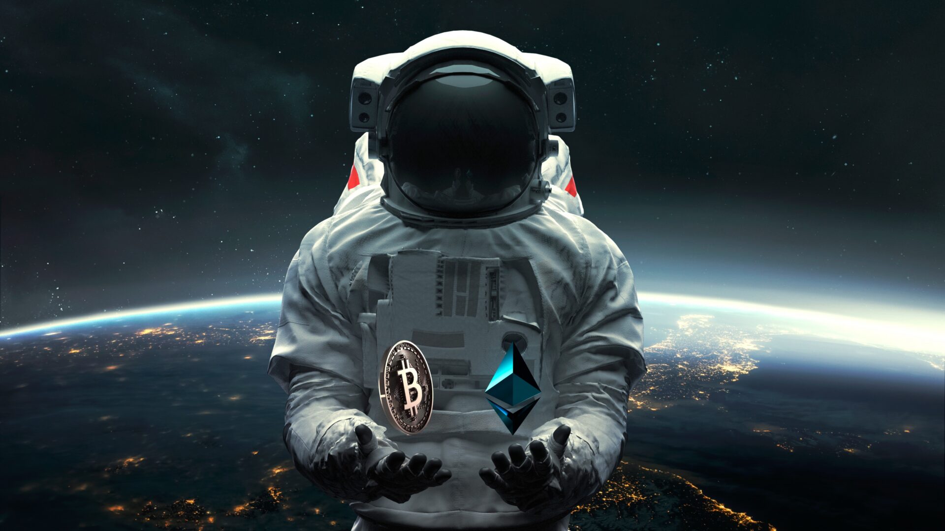 An astronaut in a white spacesuit floats above Earth's glowing blue curve, holding Bitcoin and Ethereum logos against the starry black cosmo…