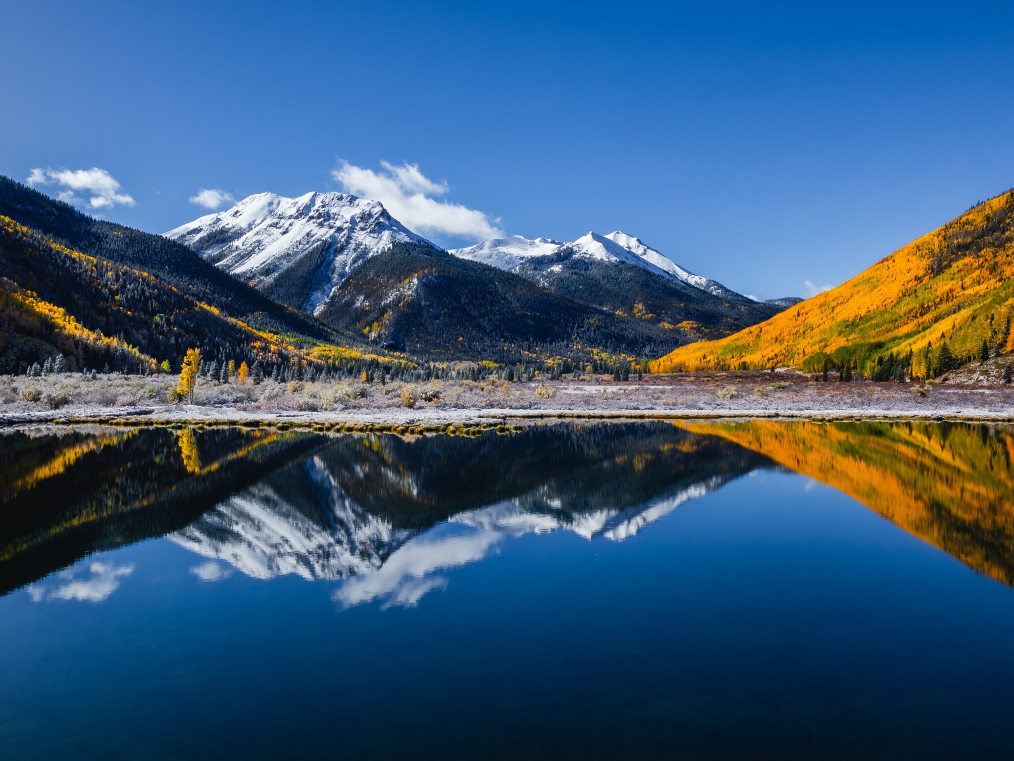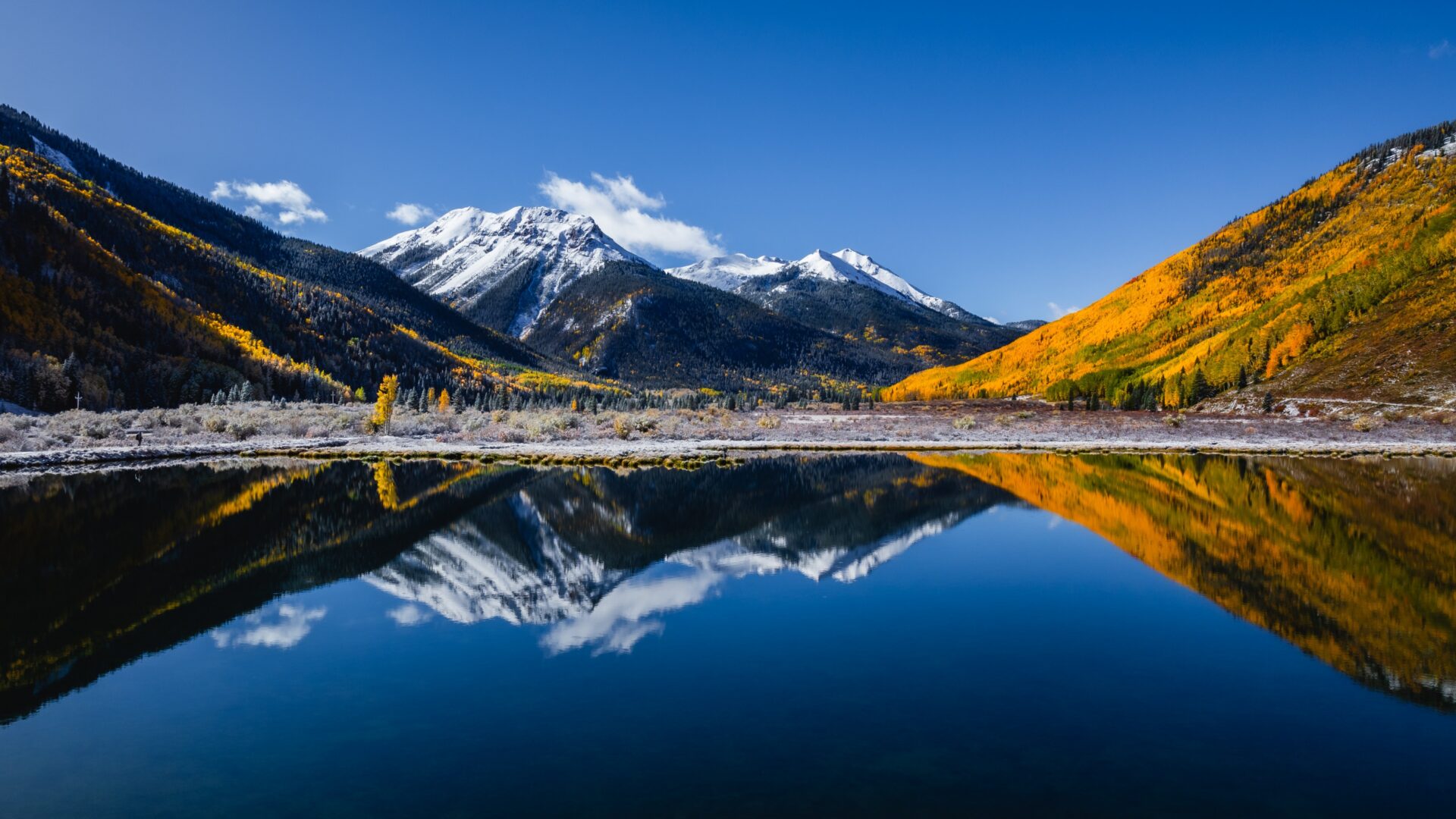 Snow-capped mountains reflect in still waters while golden aspen trees blanket the hillsides under bright blue skies. This Colorado autumn scene works beautifully for ultrawide monitors and desktop backgrounds.