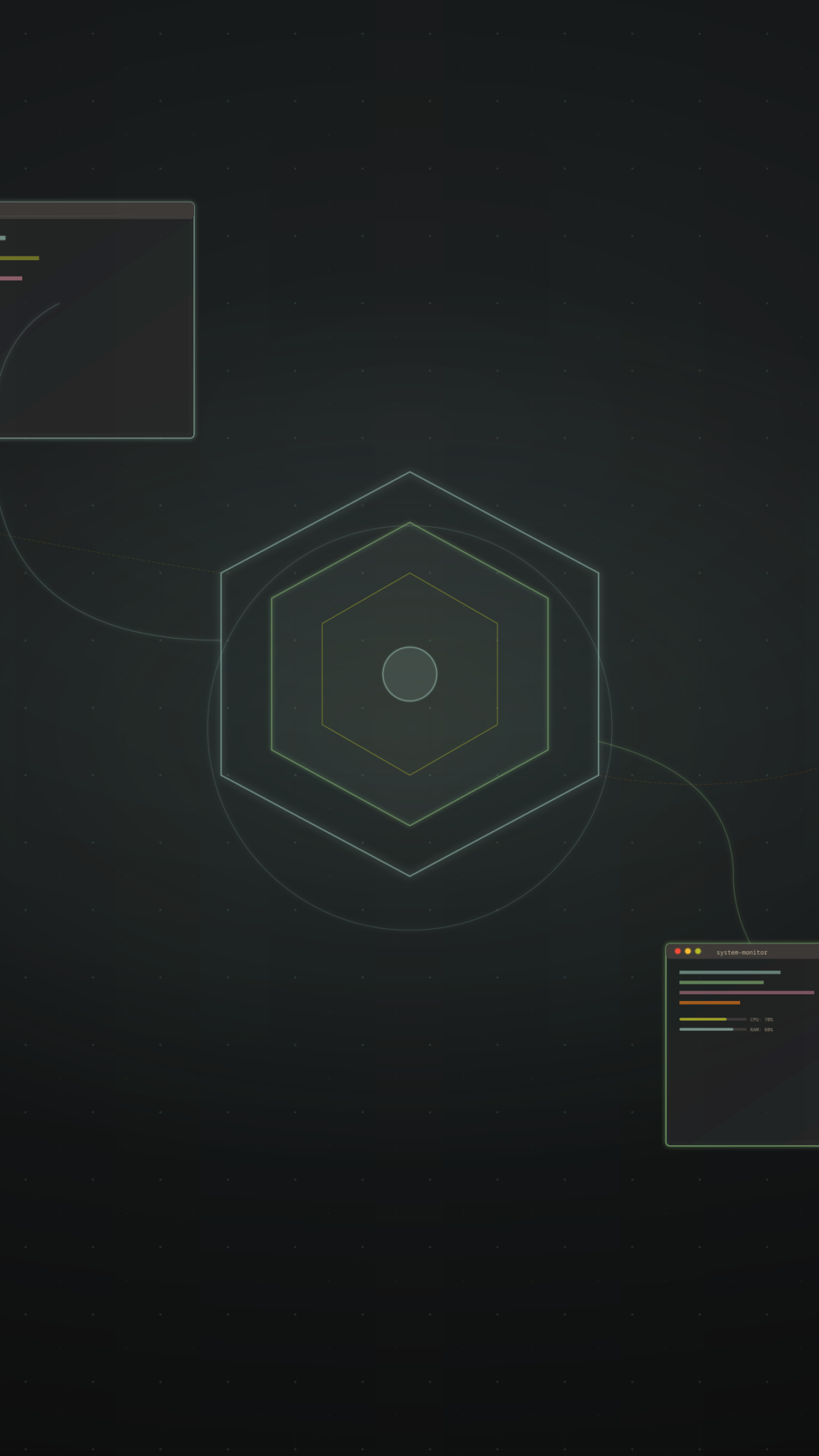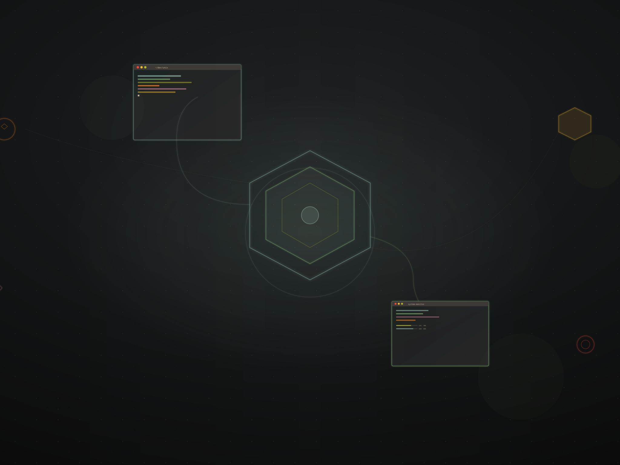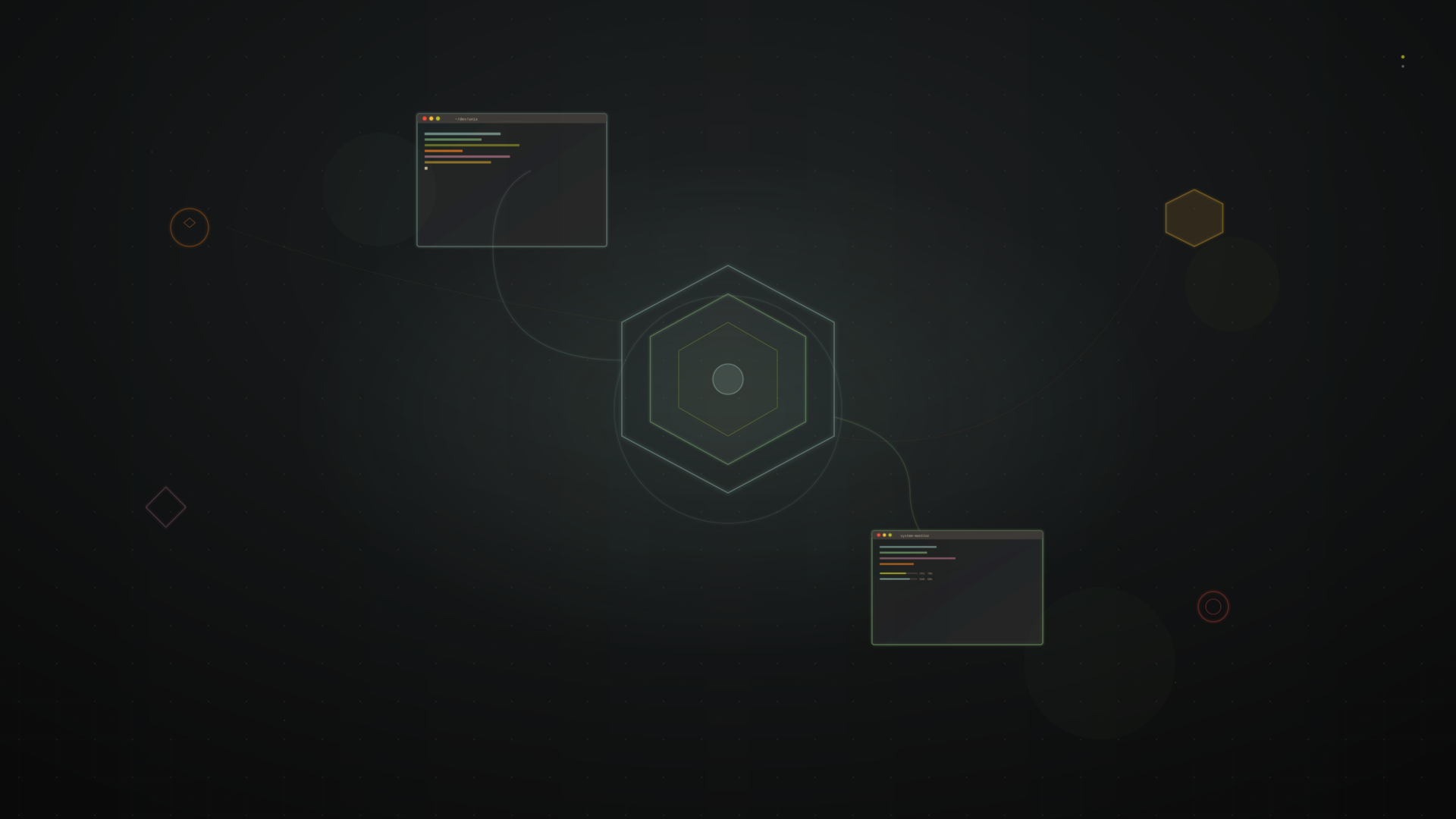 The image features a dark background with three windows displaying code in various colors, connected by a line that leads to a hexagonal shape in the center, surrounded by additional hexagons and symbols.
