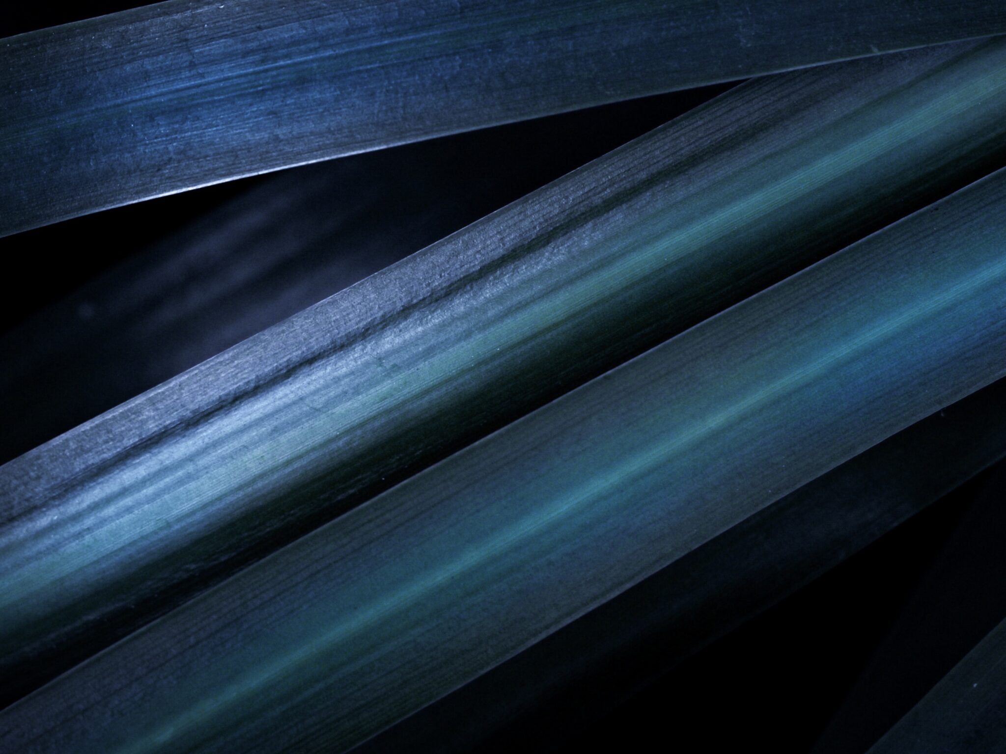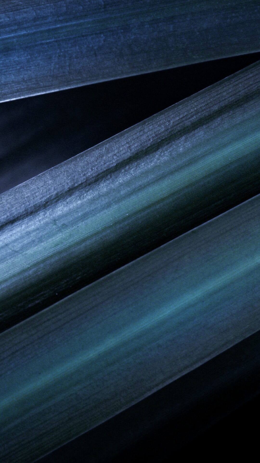 Deep teal and steel blue plant leaves layered against a dark background, with soft light catching the surface texture in this moody botanica