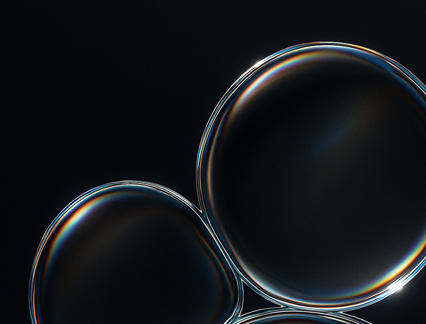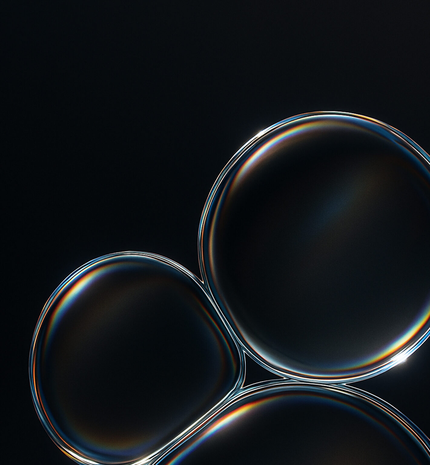 Three translucent bubbles overlap against a solid black background. Subtle rainbow reflections and internal shading give the circles a liqui