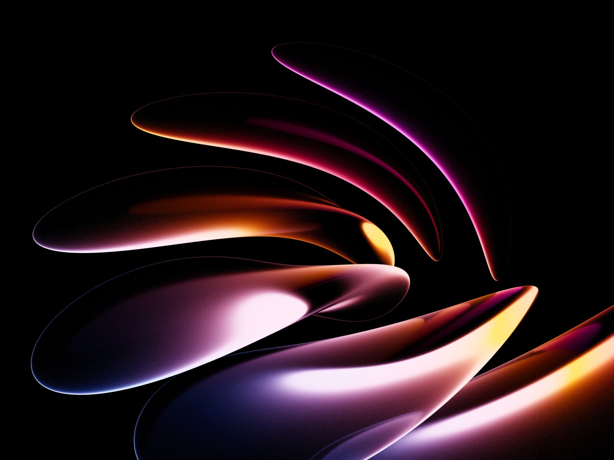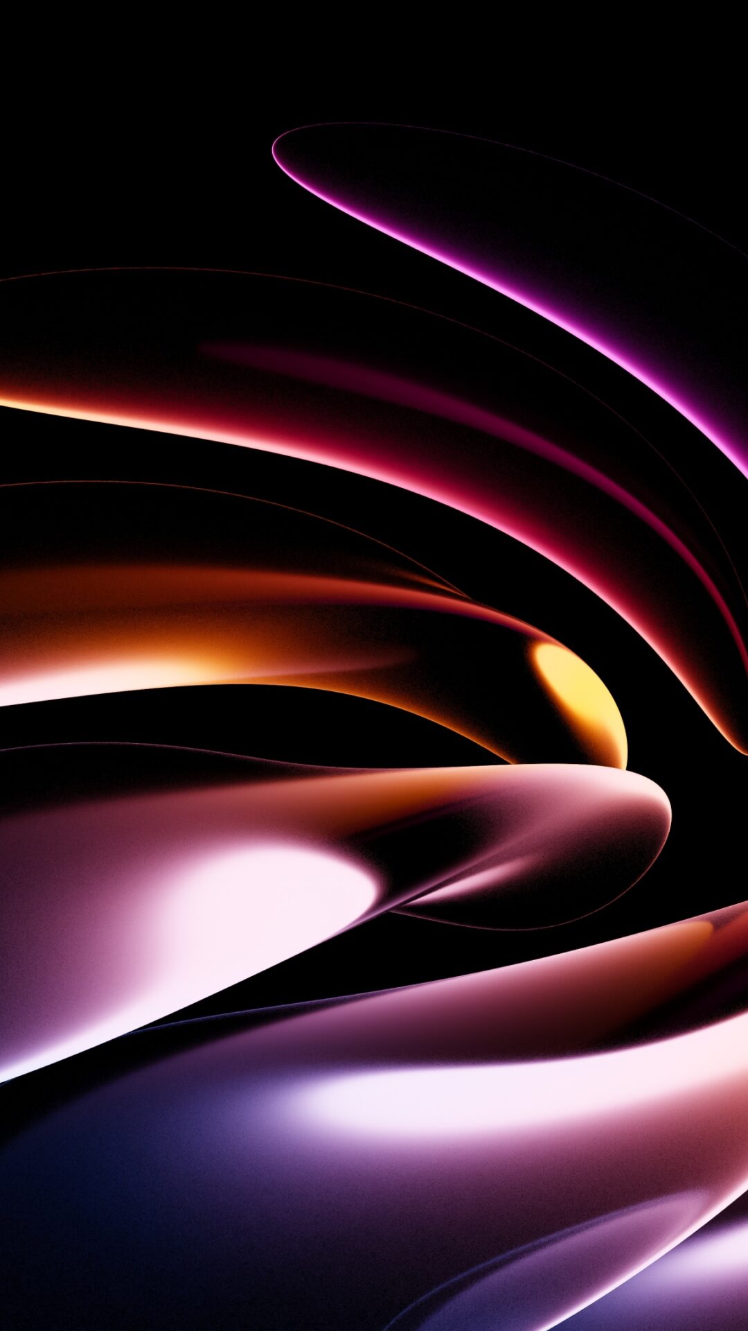 Smooth glowing ribbons in purple, pink, and warm orange twist and curl against a pure black background, giving off that sleek 3D render vibe