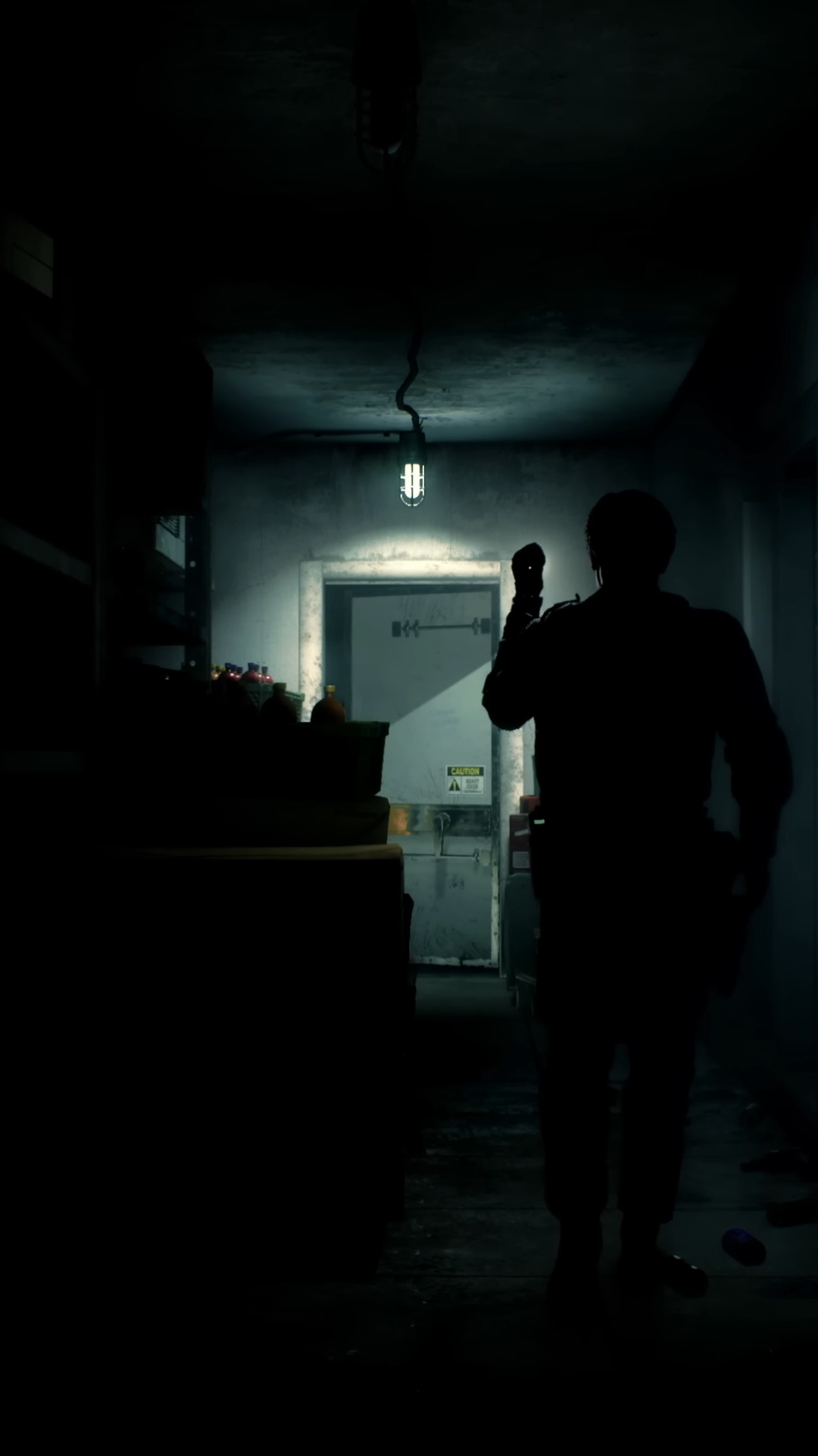 This 4K wallpaper features a dimly lit hallway with a person standing in the shadows, holding a gun in their right hand. The image is a dark…