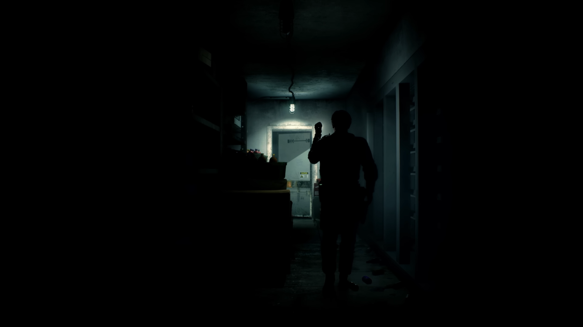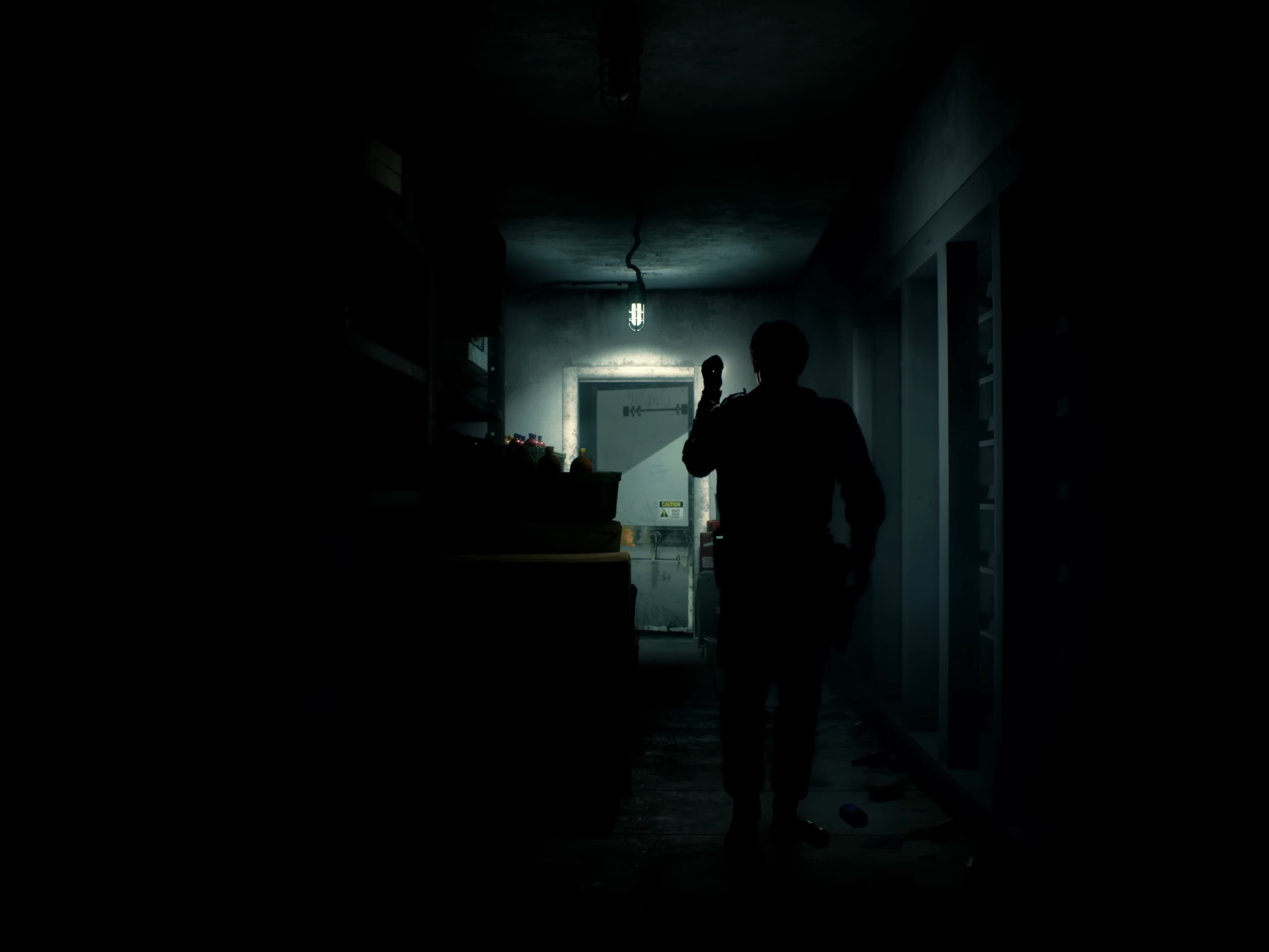 Dark Hallway with Gun-Wielding Silhouette Desktop Wallpaper 4K