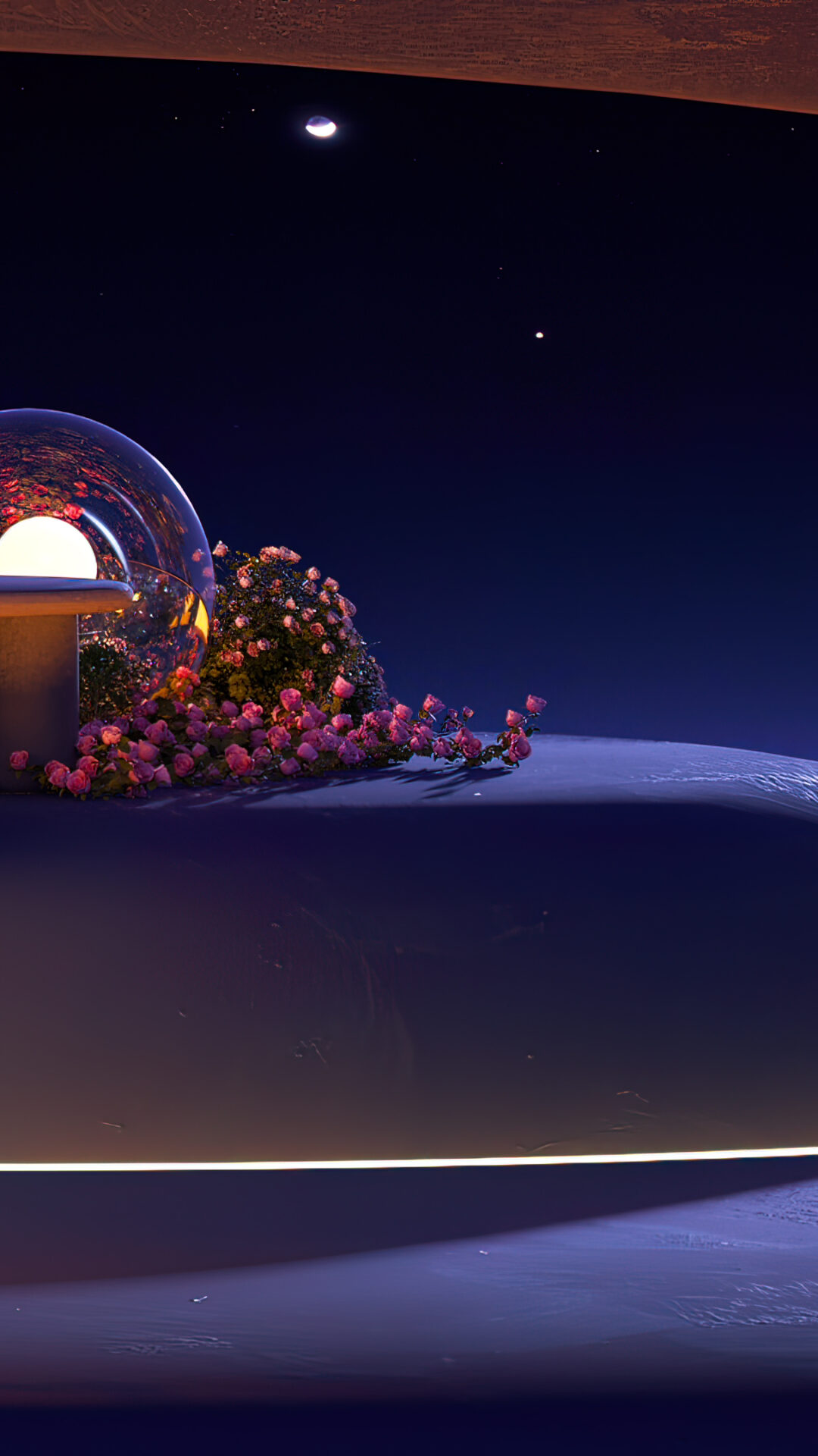 Futuristic space garden with a glass dome glowing warm orange, surrounded by pink and yellow flowers against a deep indigo sky and golden su