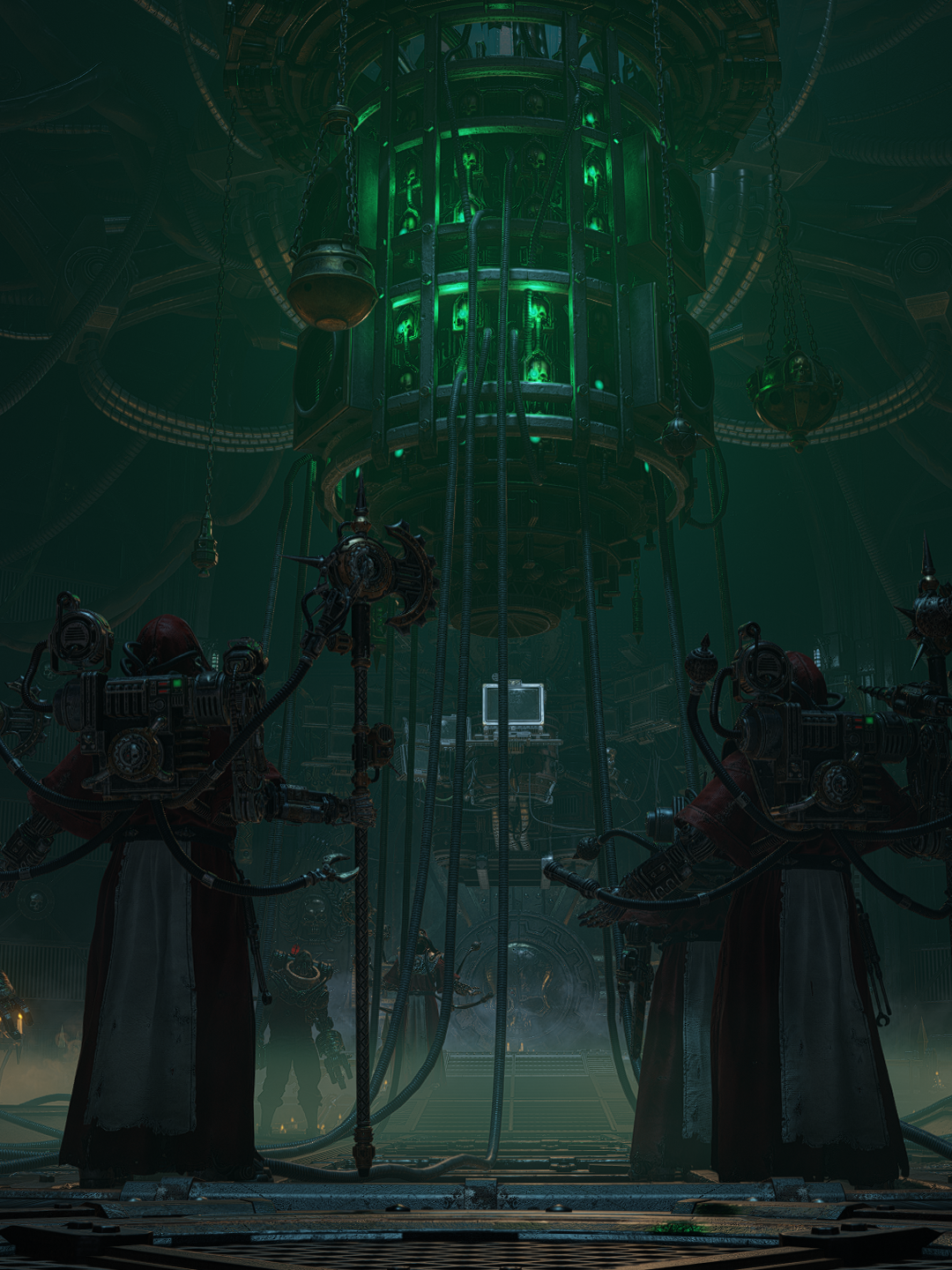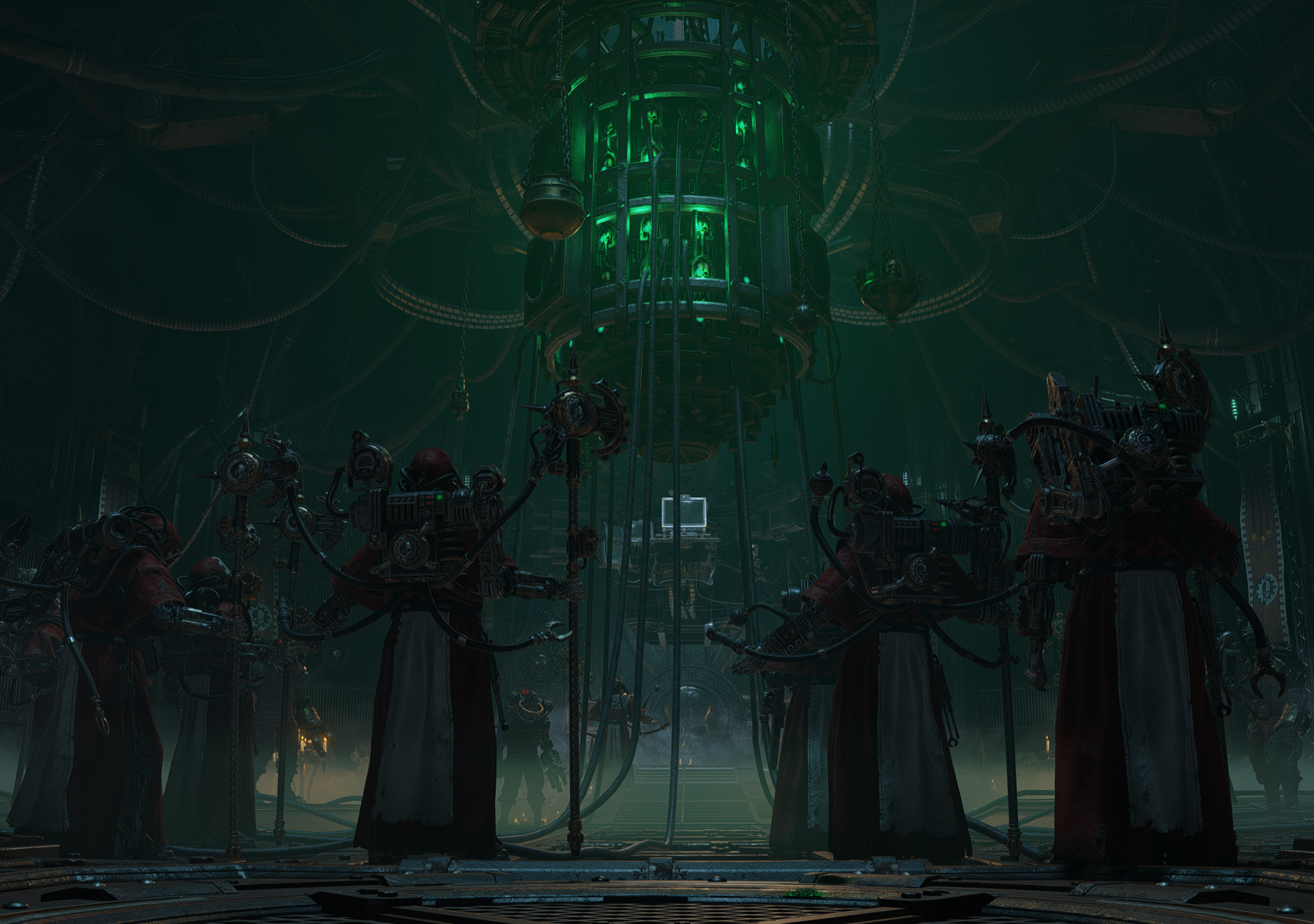 Dark, Ominous Scene with Robed Figures and Green-Lit Structure… wallpaper 4K