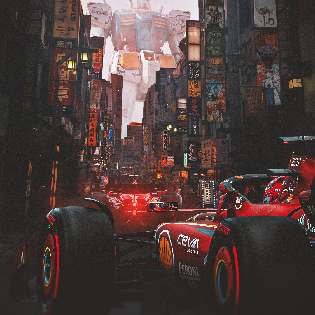 A sleek muscle car rendered in deep purple and charcoal tones sits low against a moody black backdrop. Heavy shadows and metallic gray highl…