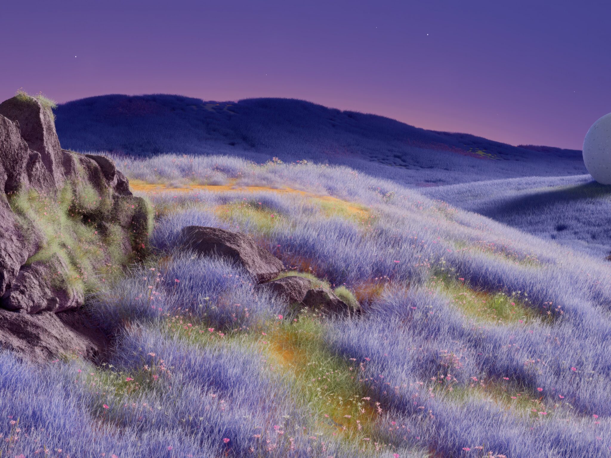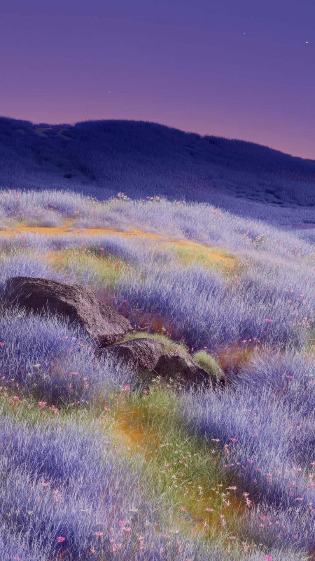 Purple and lavender hues dominate this dreamy landscape featuring weathered rock formations, rolling hills covered in violet grass, and a gl…