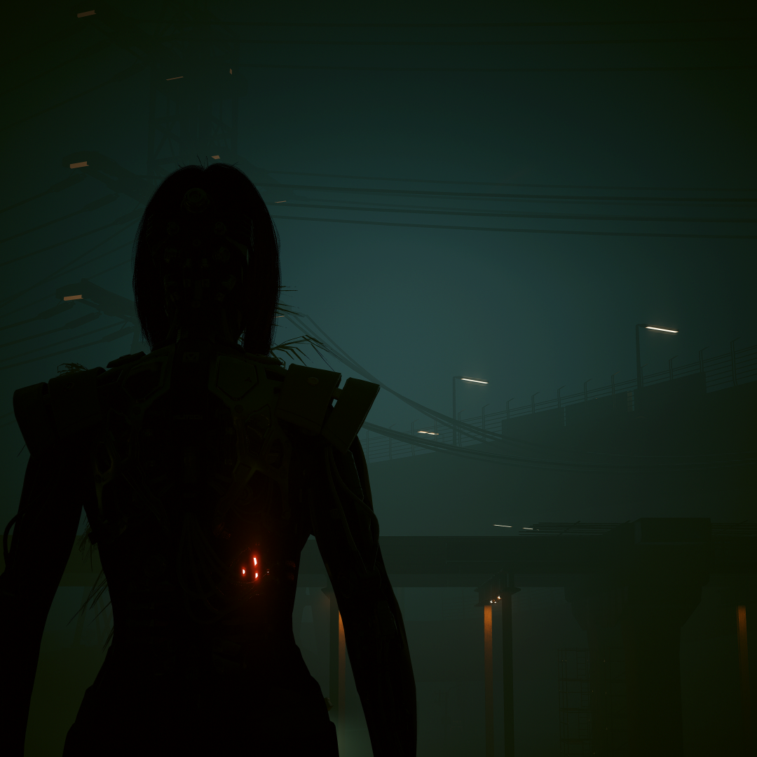 This moody sci-fi wallpaper features a dark silhouette of a woman in a futuristic room with metallic pillars, evoking a dystopian cyberpunk …