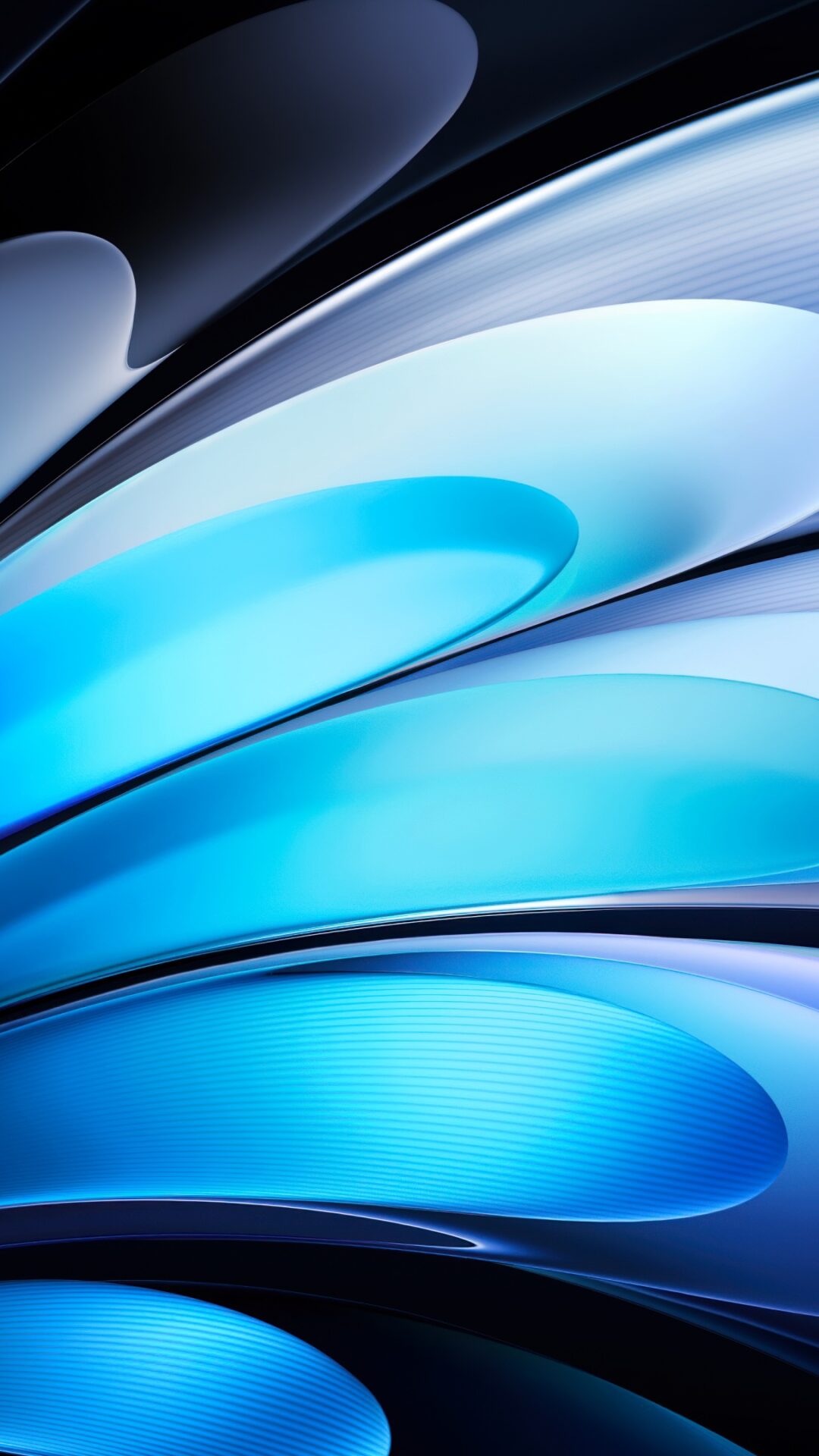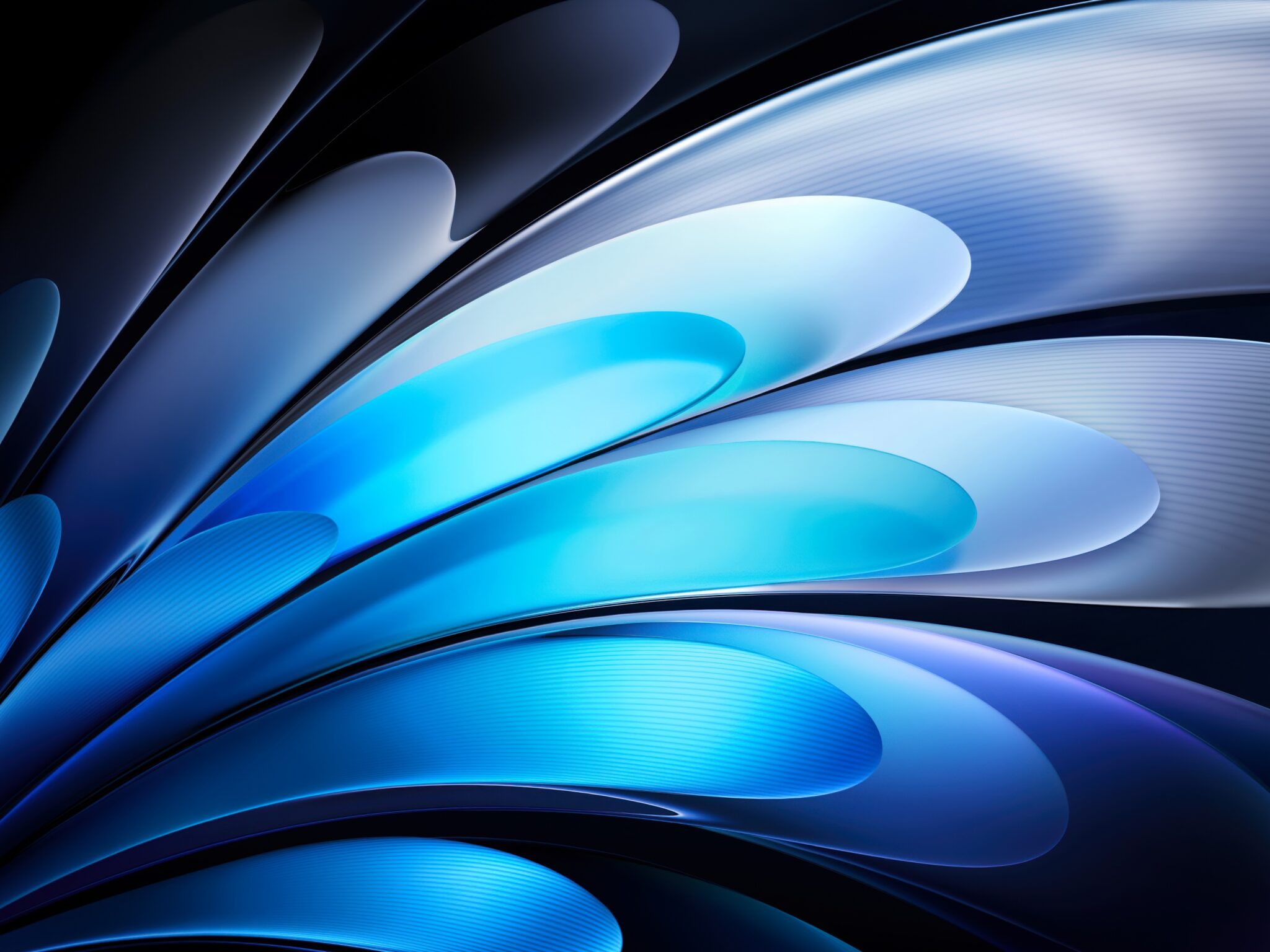 Smooth curved petals fan out from a central point in shades of cyan, cobalt blue and silver against a deep black background. For 4K monitors, this abstract piece brings a sleek modern vibe to your desktop.