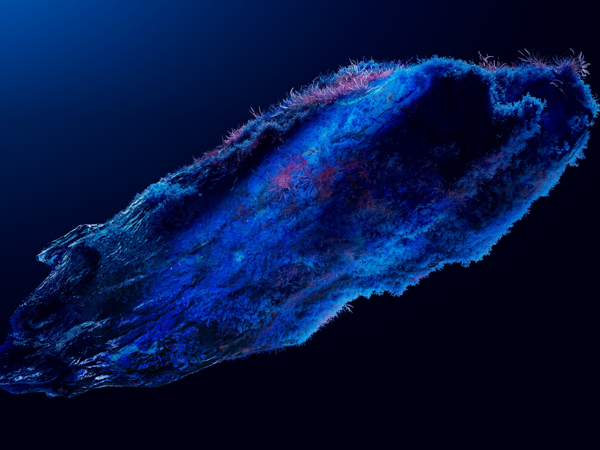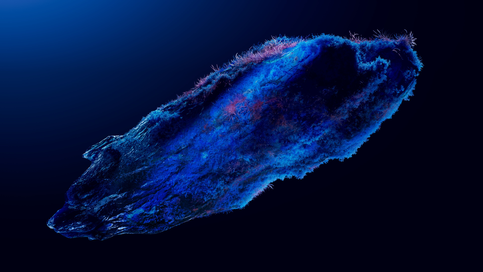 Deep electric blues and hints of purple-pink create this organic floating form that looks like something between a deep sea creature and a c…