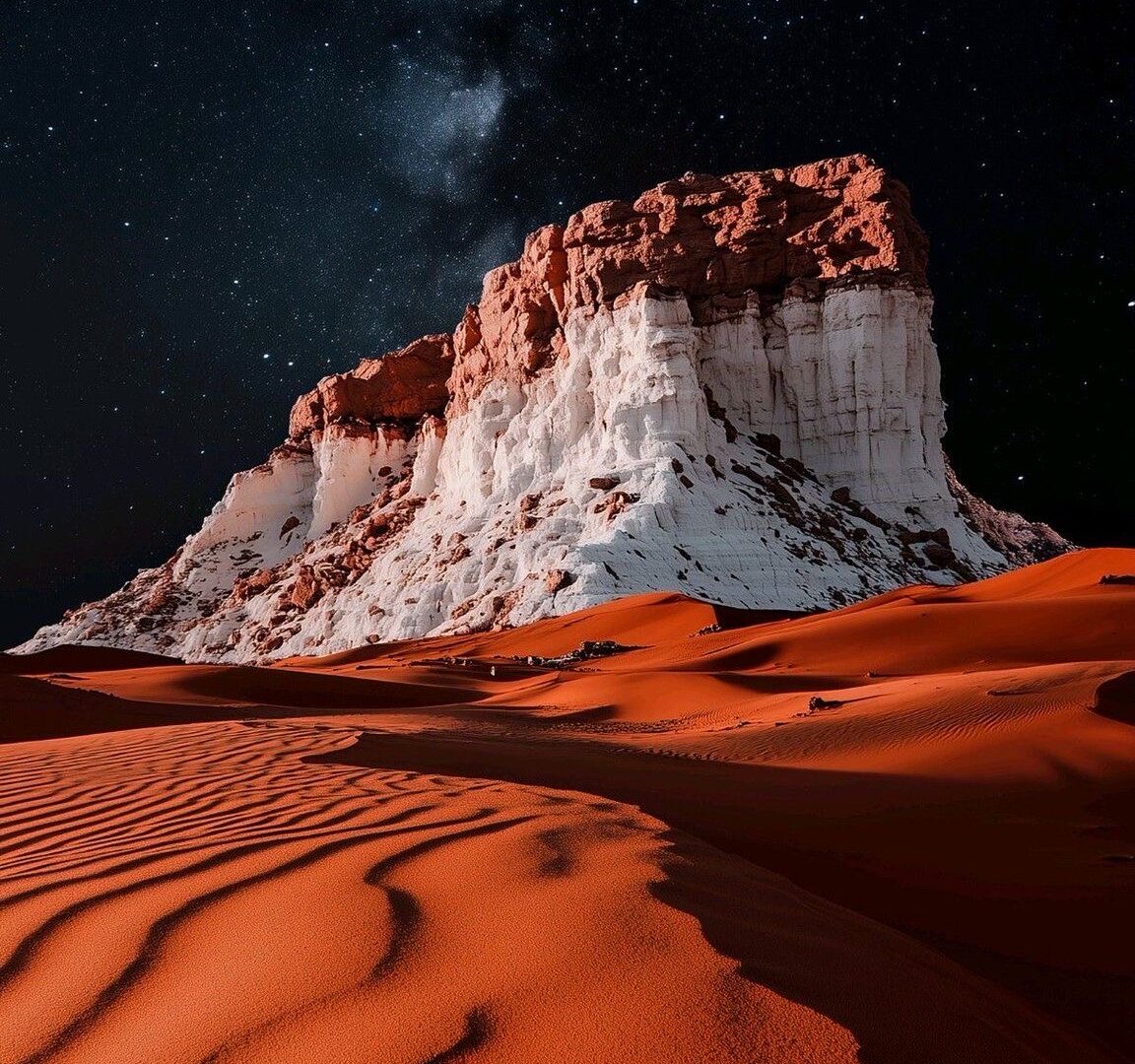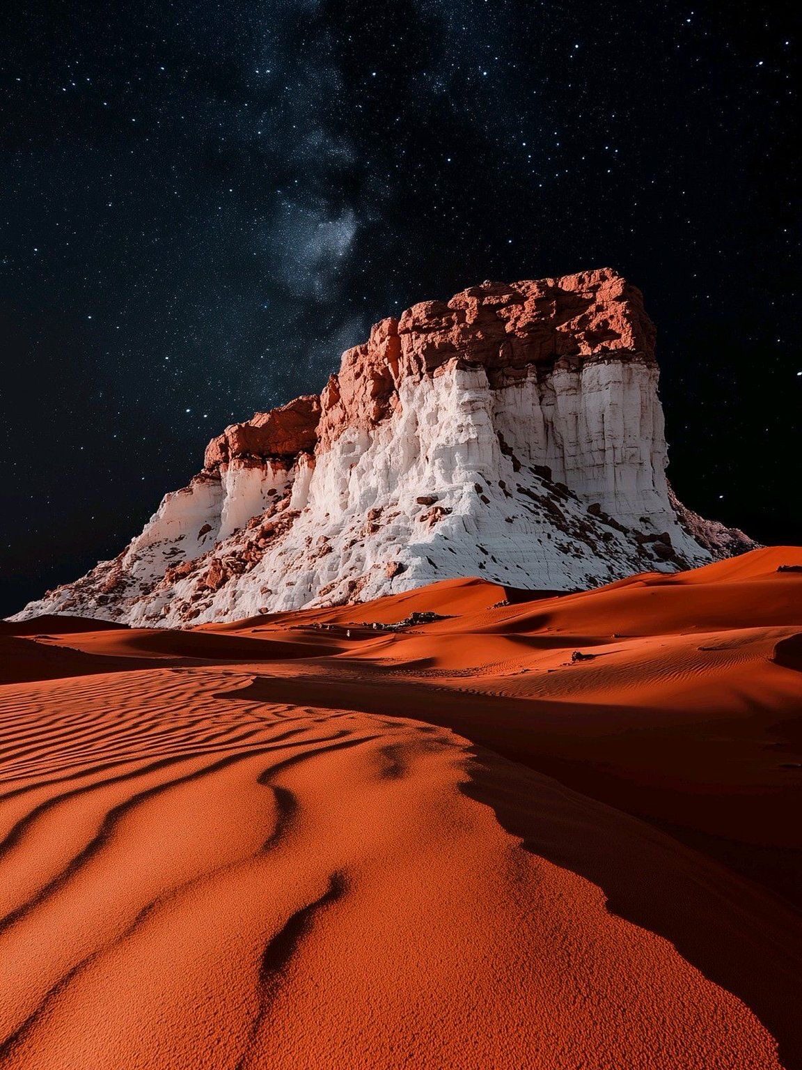 A large rock formation rises from orange sand dunes under a dark, starry sky. The sand displays a rippled texture that leads the eye towards…