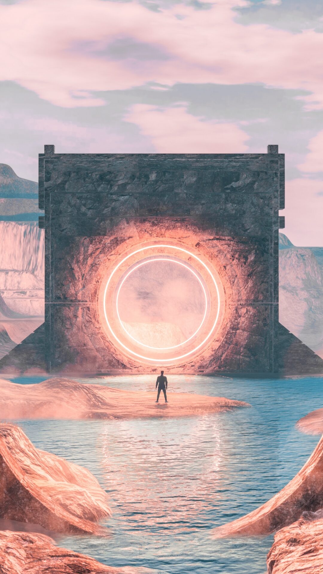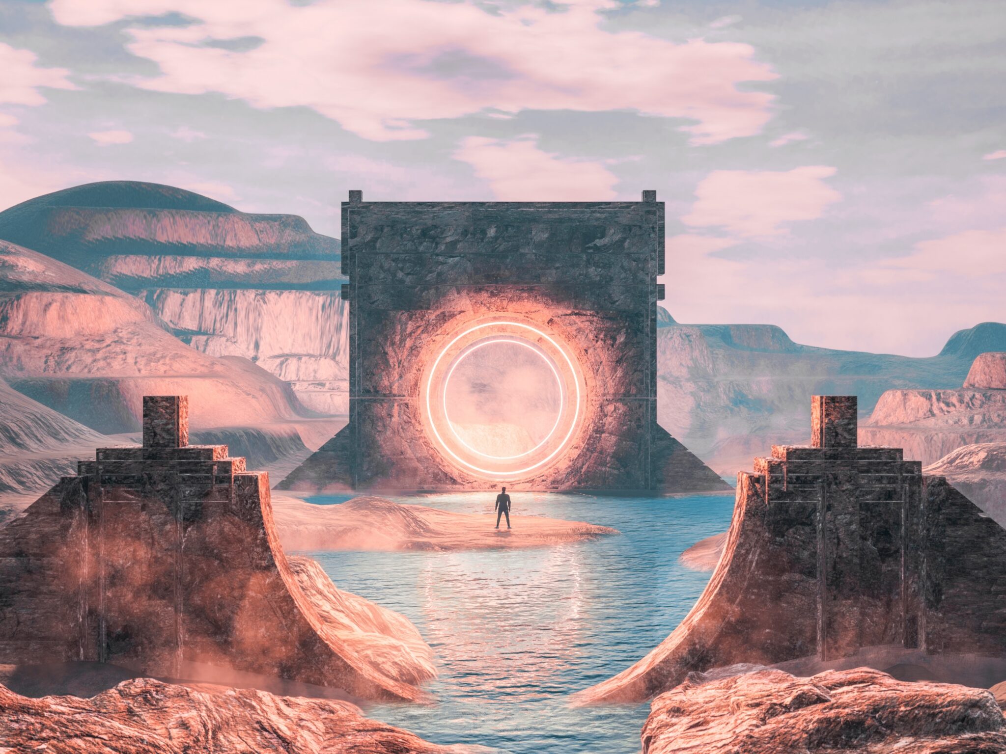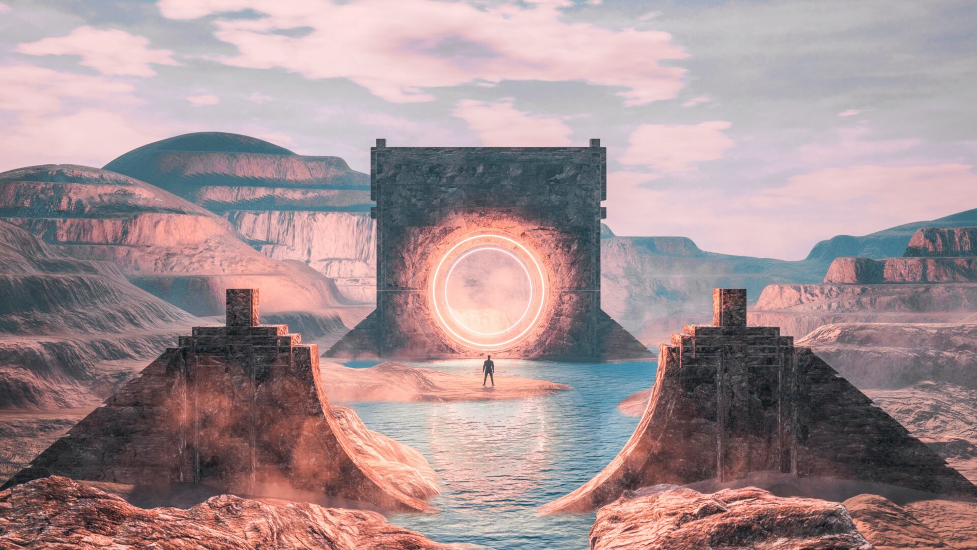 A figure stands before a glowing circular portal framed by a massive stone archway in a desert canyon landscape. Soft, hazy light washes ove