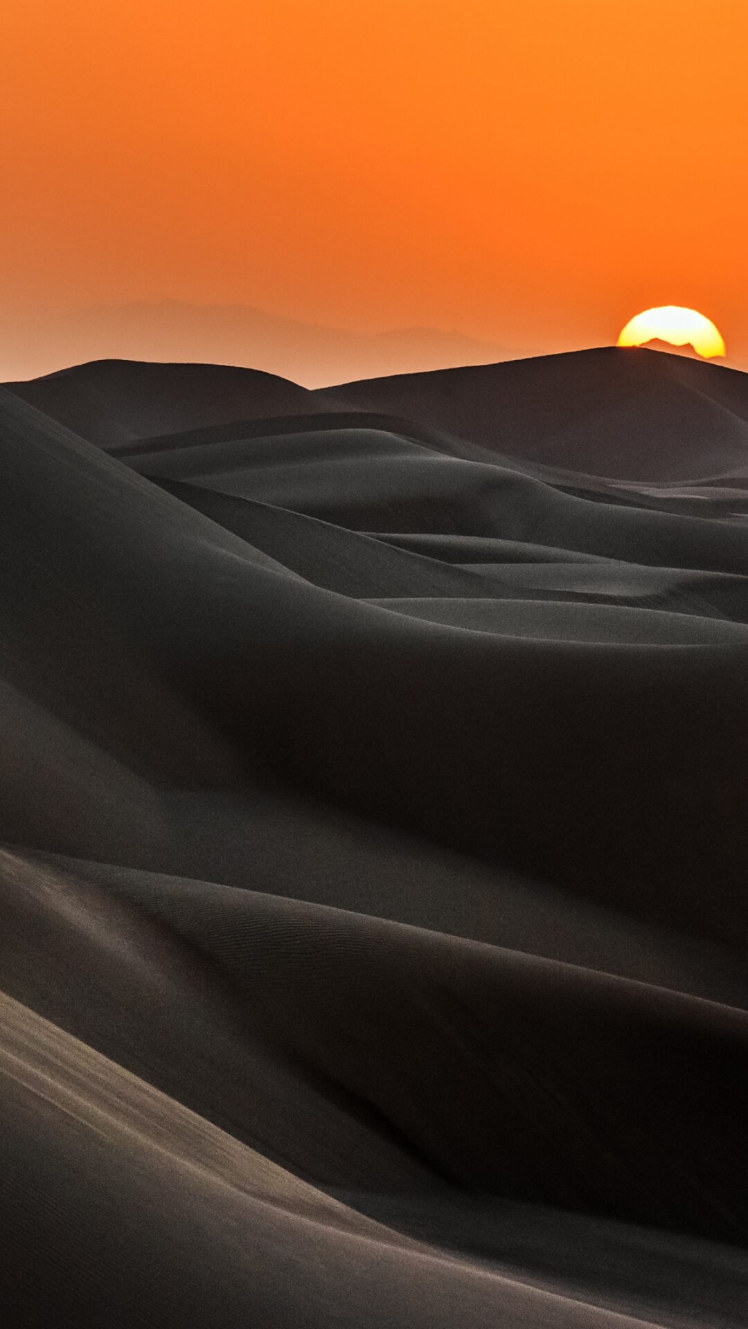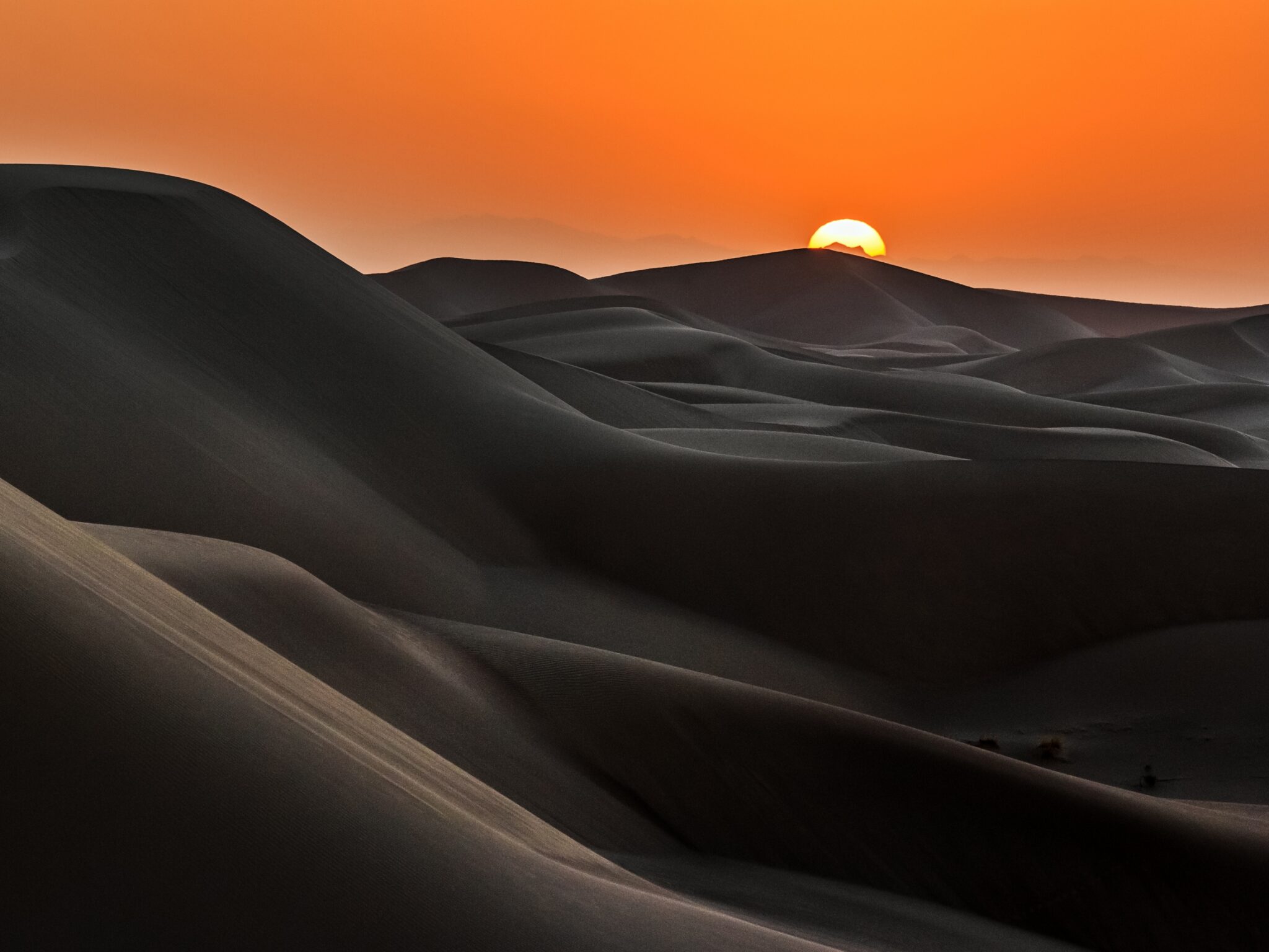 Rolling sand dunes stretch endlessly under a brilliant orange sunrise sky, with deep shadows creating dramatic contrast across the desert la
