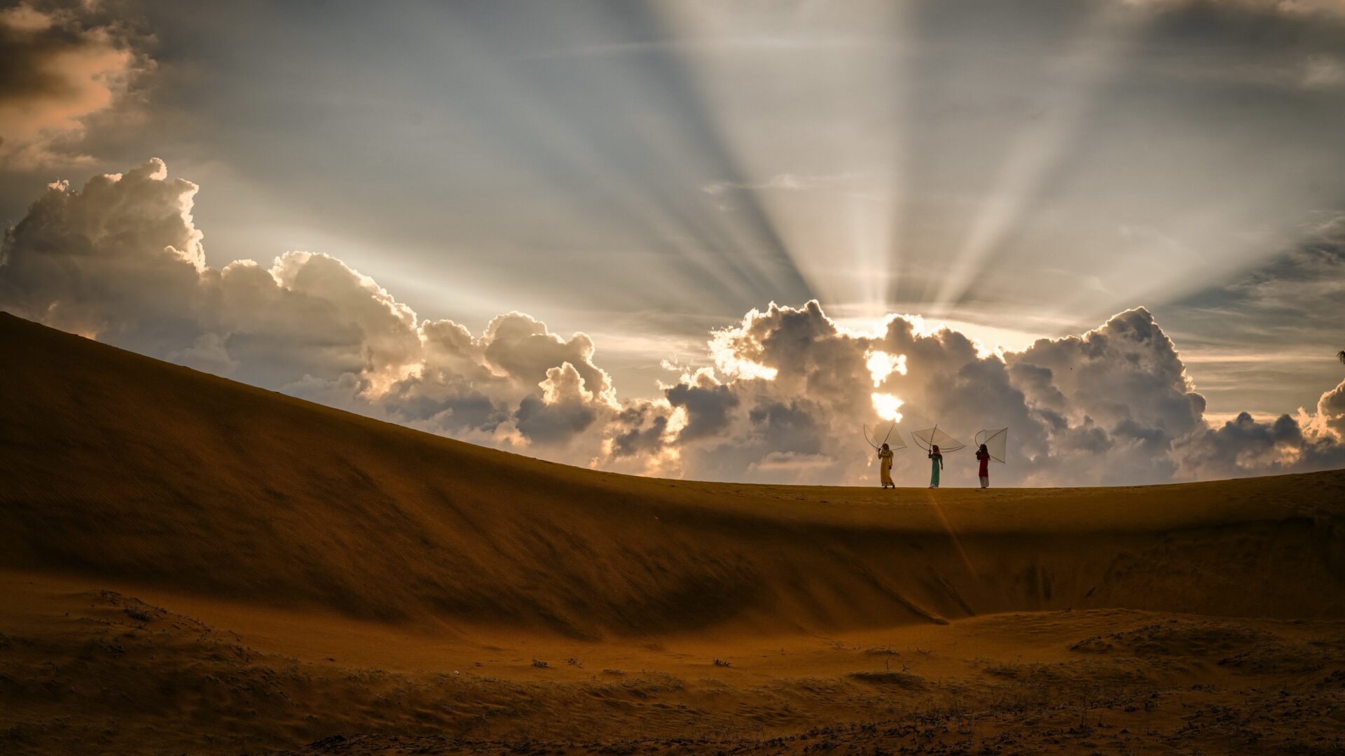 Three figures stand silhouetted on a large sand dune under a cloudy sky. Golden sunlight breaks through the clouds, creating strong rays and