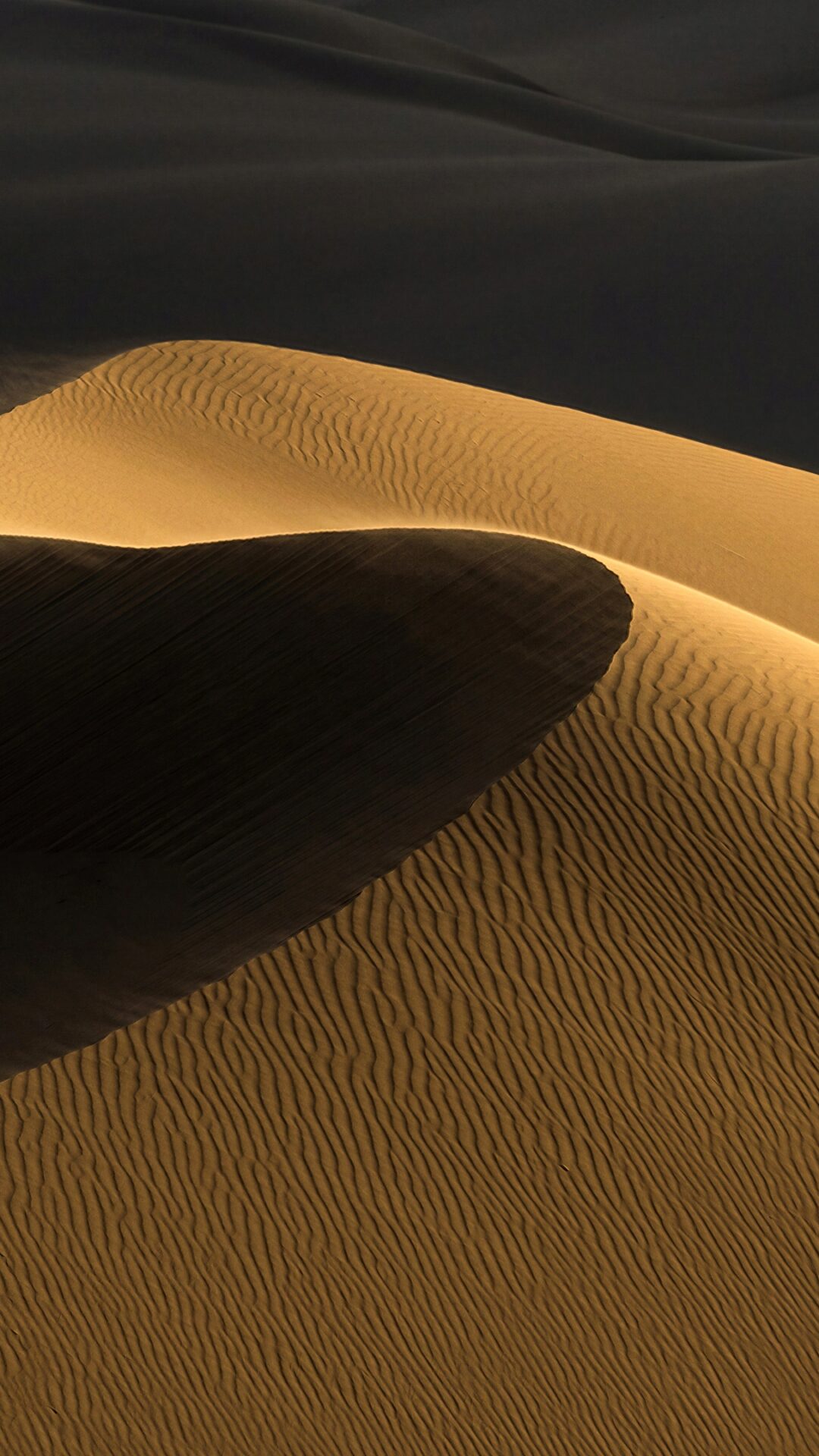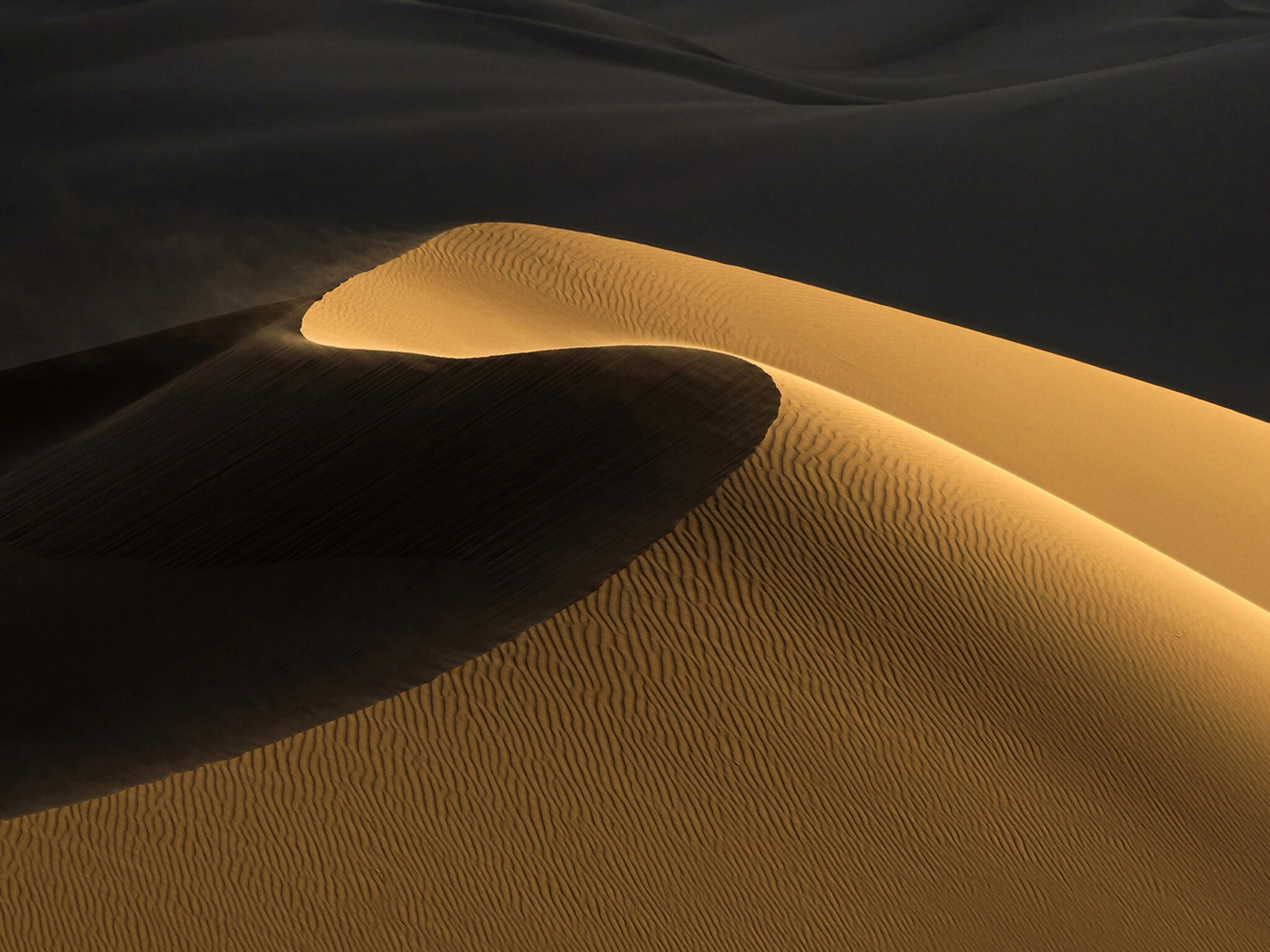 Golden hour light catches the curved ridges of sand dunes, creating warm honey and amber tones against deep charcoal shadows. The rippled te