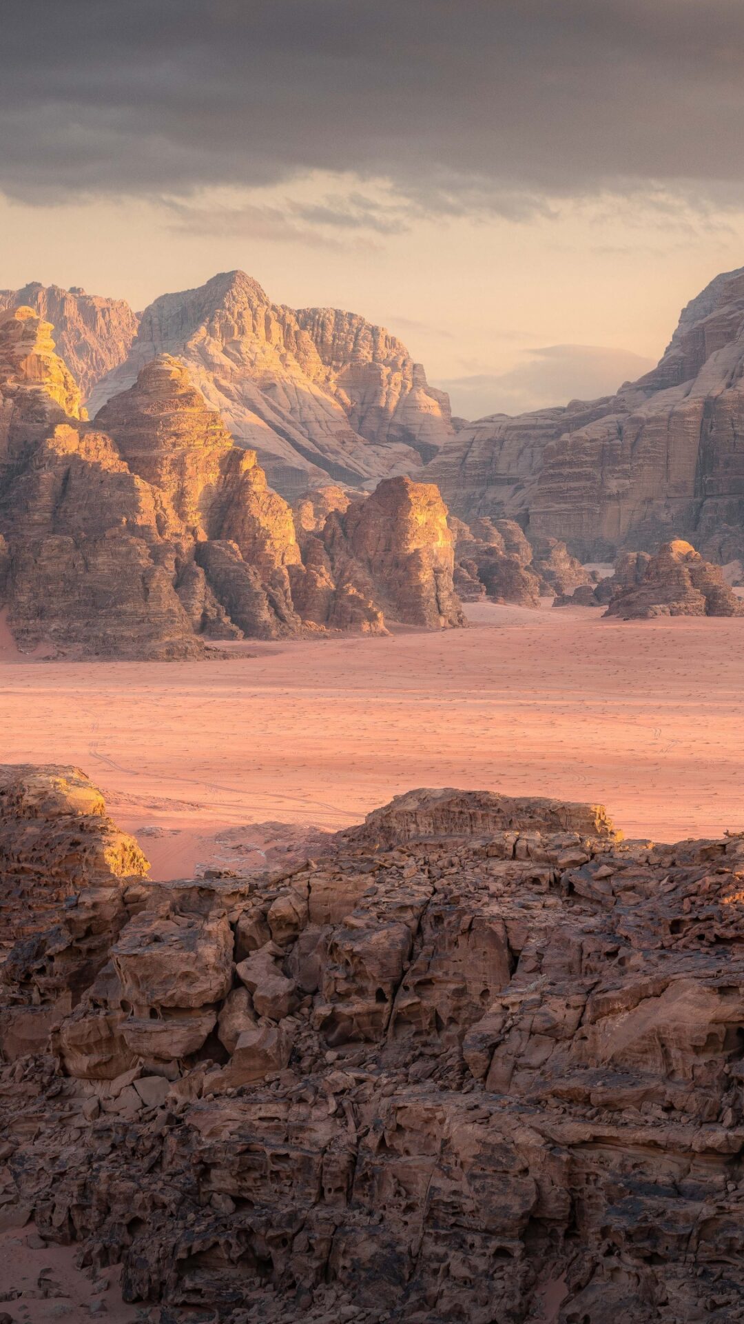 A wide landscape shows layered sandstone mountains and a pink sandy foreground. Warm evening light creates strong shadows and highlights acr…