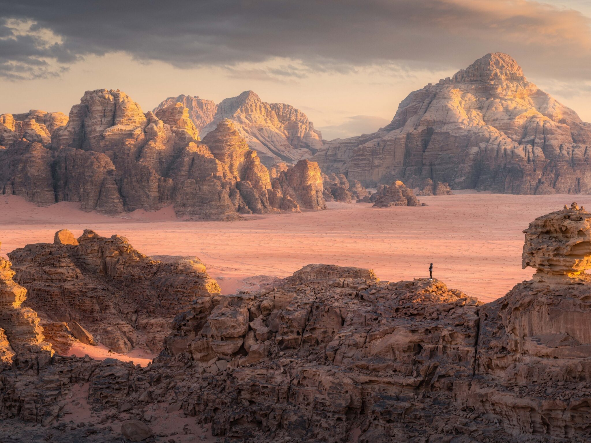 A wide landscape shows layered sandstone mountains and a pink sandy foreground. Warm evening light creates strong shadows and highlights across the rock formations and a single small figure.
