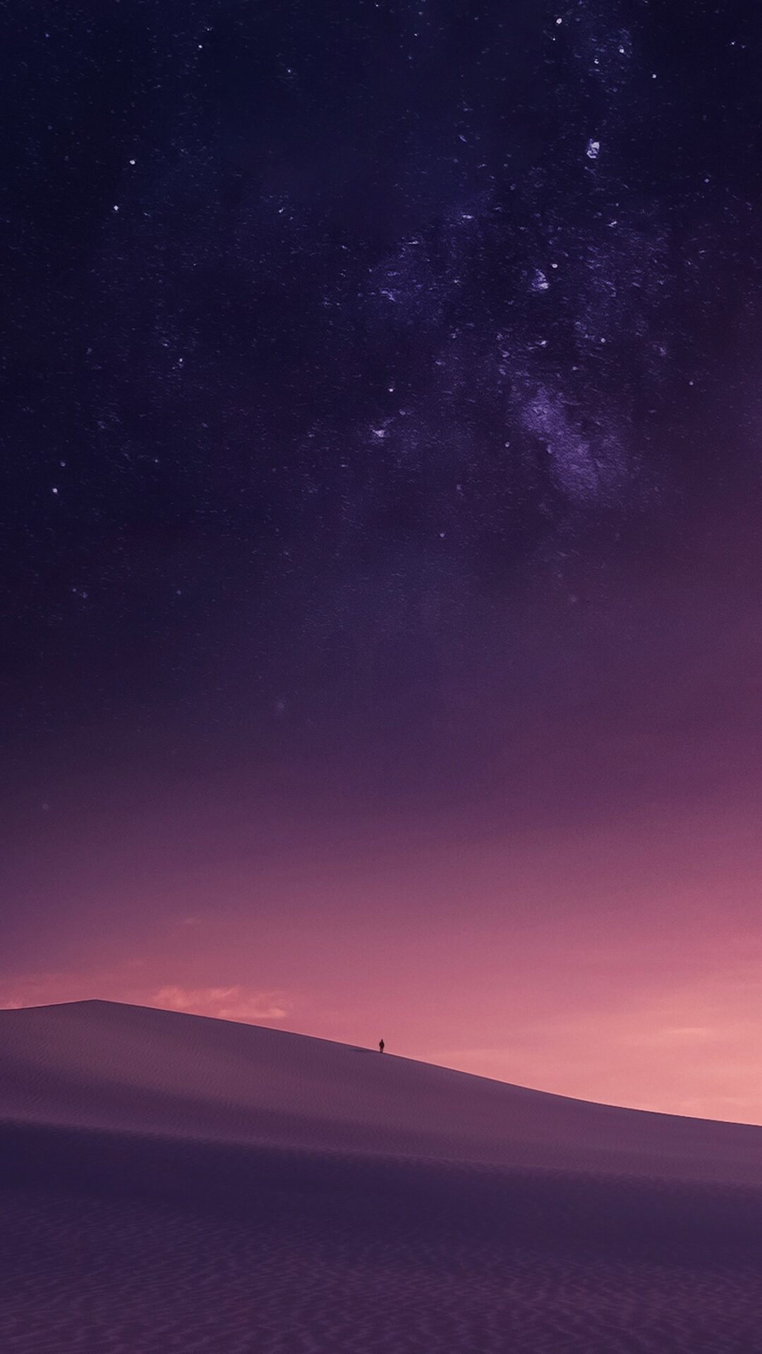 Rolling sand dunes stretch towards a dark night sky filled with stars. The gradient from deep indigo to pale rose creates a sense of quiet d
