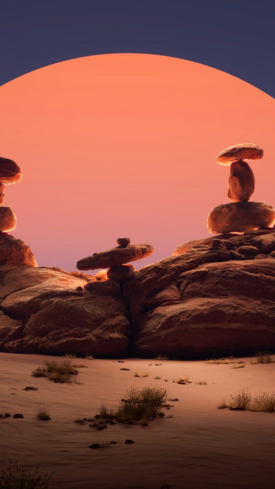 Stacked rocks form cairns on a sandy dune in a desert landscape against a large, glowing orange sun. Soft light illuminates the textured roc…