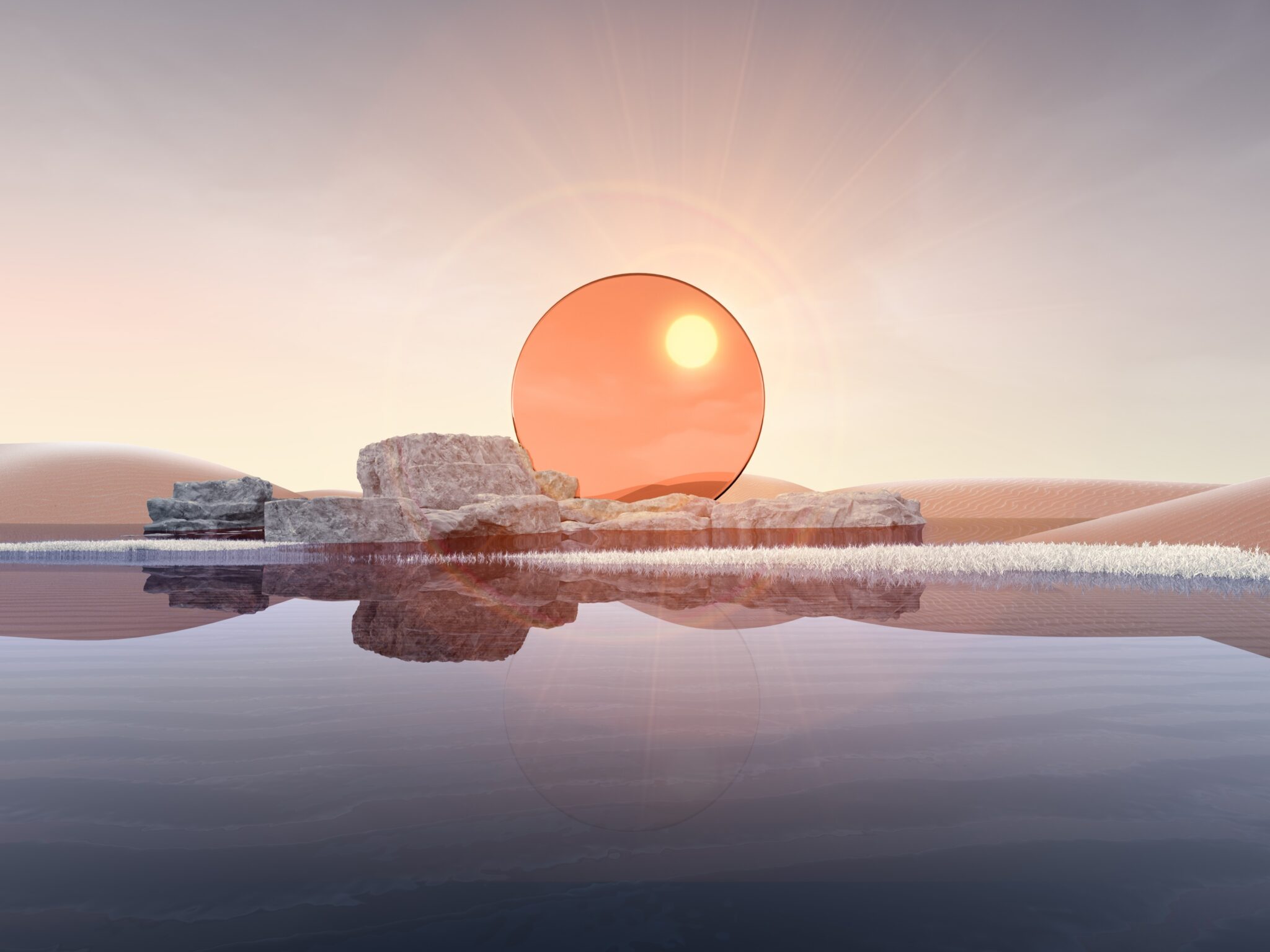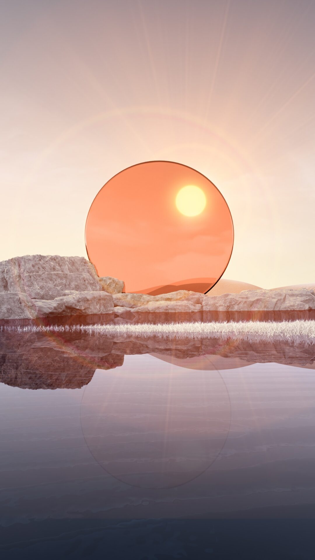 Peaceful lake waters mirror rocky desert formations beneath a large coral-orange sun and soft pink-purple sky. Made for 4K desktop displays