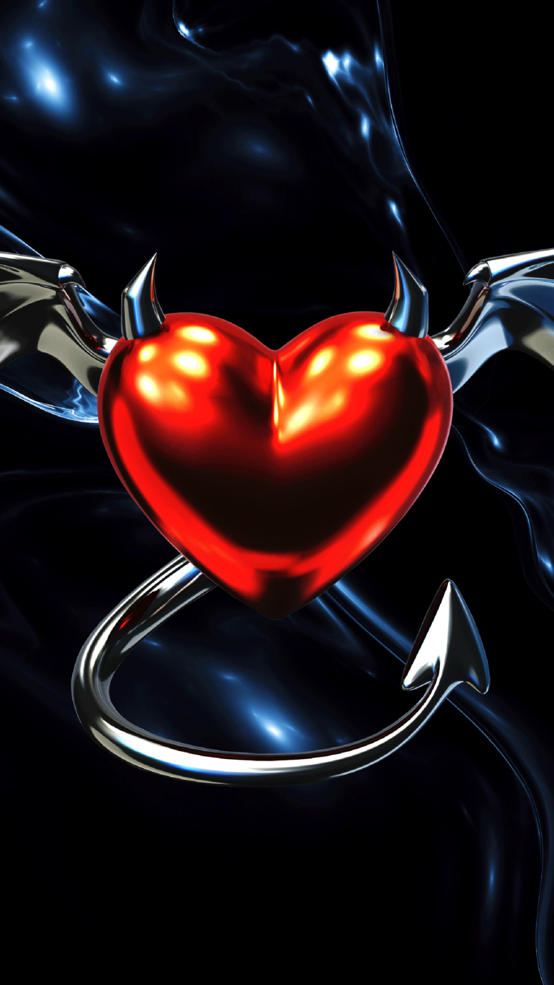 A glossy red heart is pierced by a silver hook and adorned with small metallic wings. Dark, swirling fabric surrounds the heart, creating a high-contrast, reflective surface.