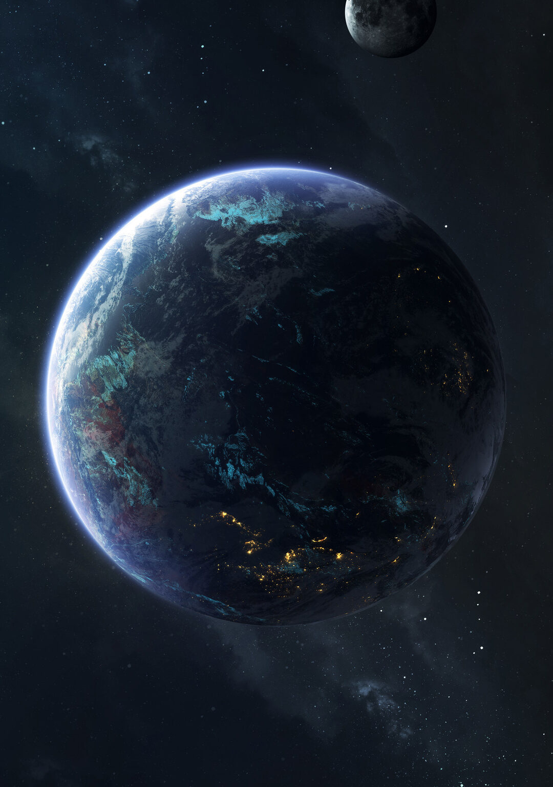 A blue and dark planet dominates the frame, with a smaller gray moon visible above it. Sparse, bright points of light suggest city lights on