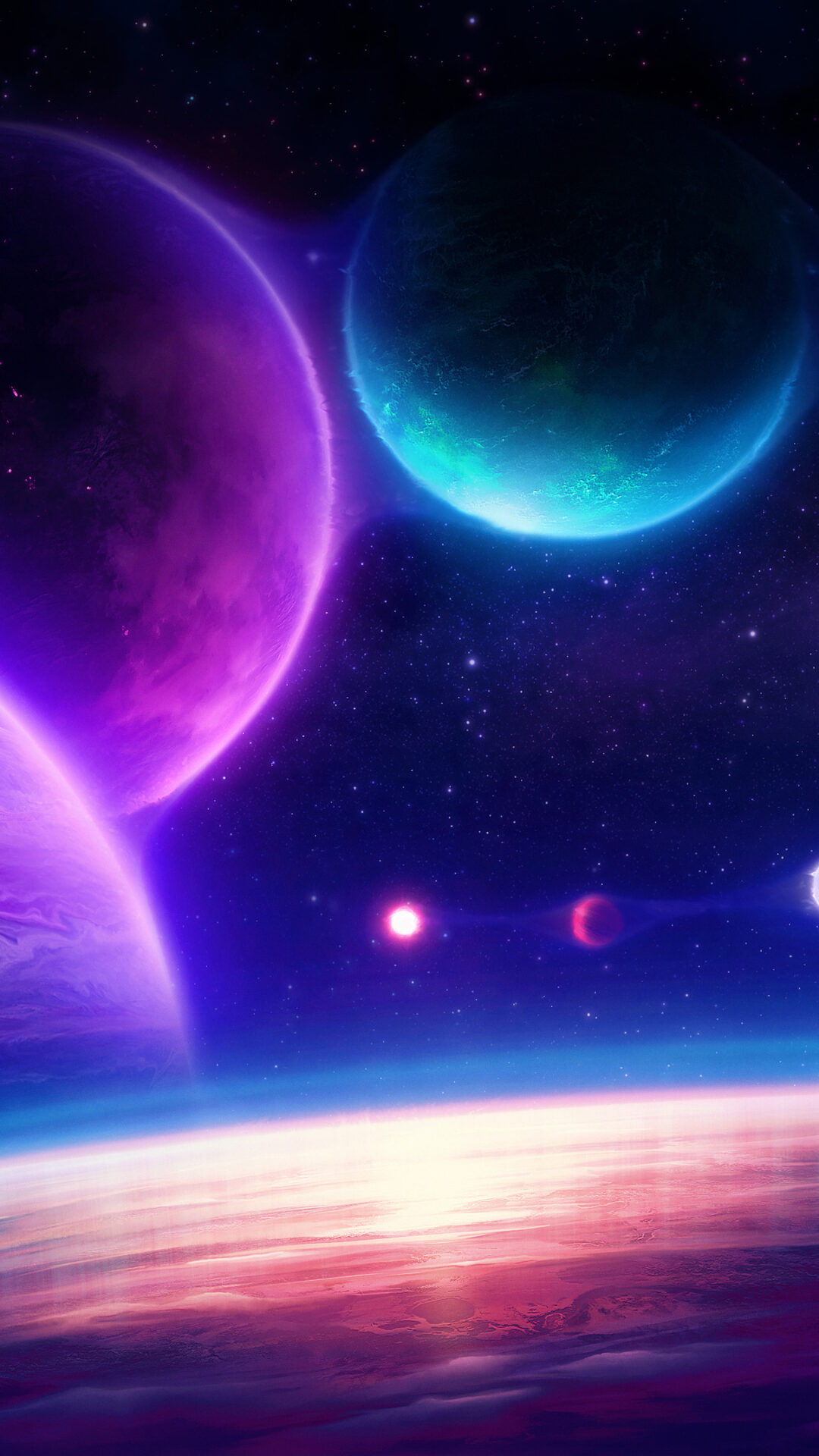 Several colorful planets are arranged against a dark, starry sky. The glow around each planet and the reflected light on the lower horizon c…
