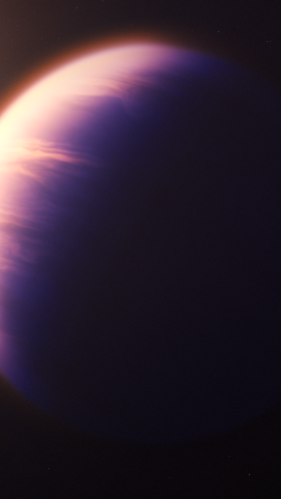 A large planet with purple and orange cloud formations is positioned next to a bright, glowing star. The dark background is speckled with ti
