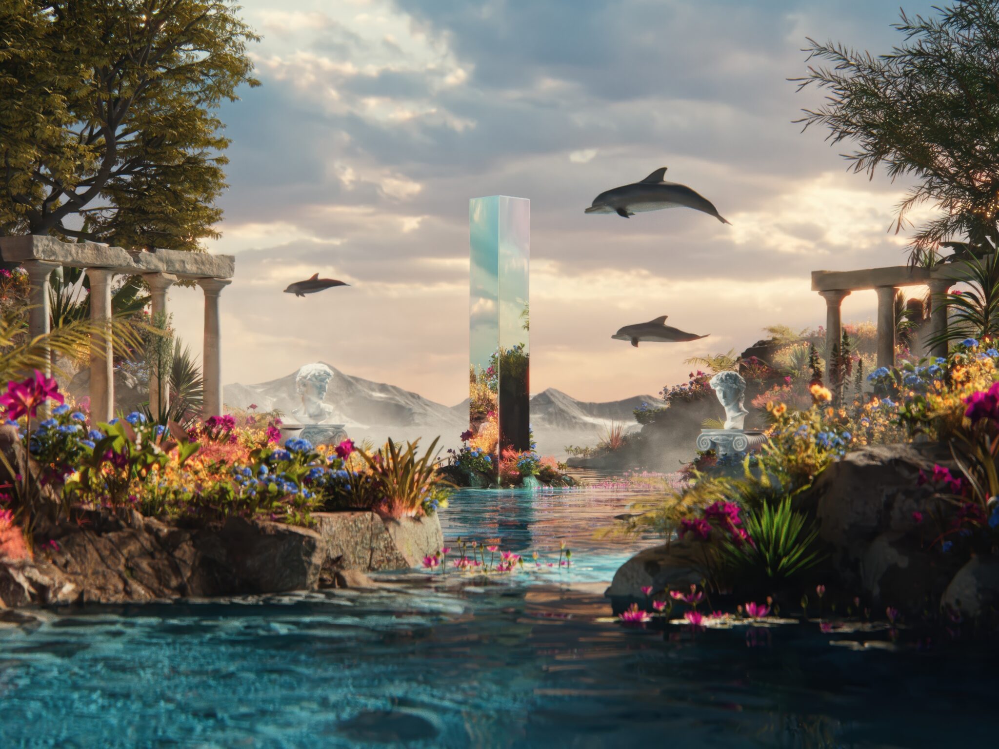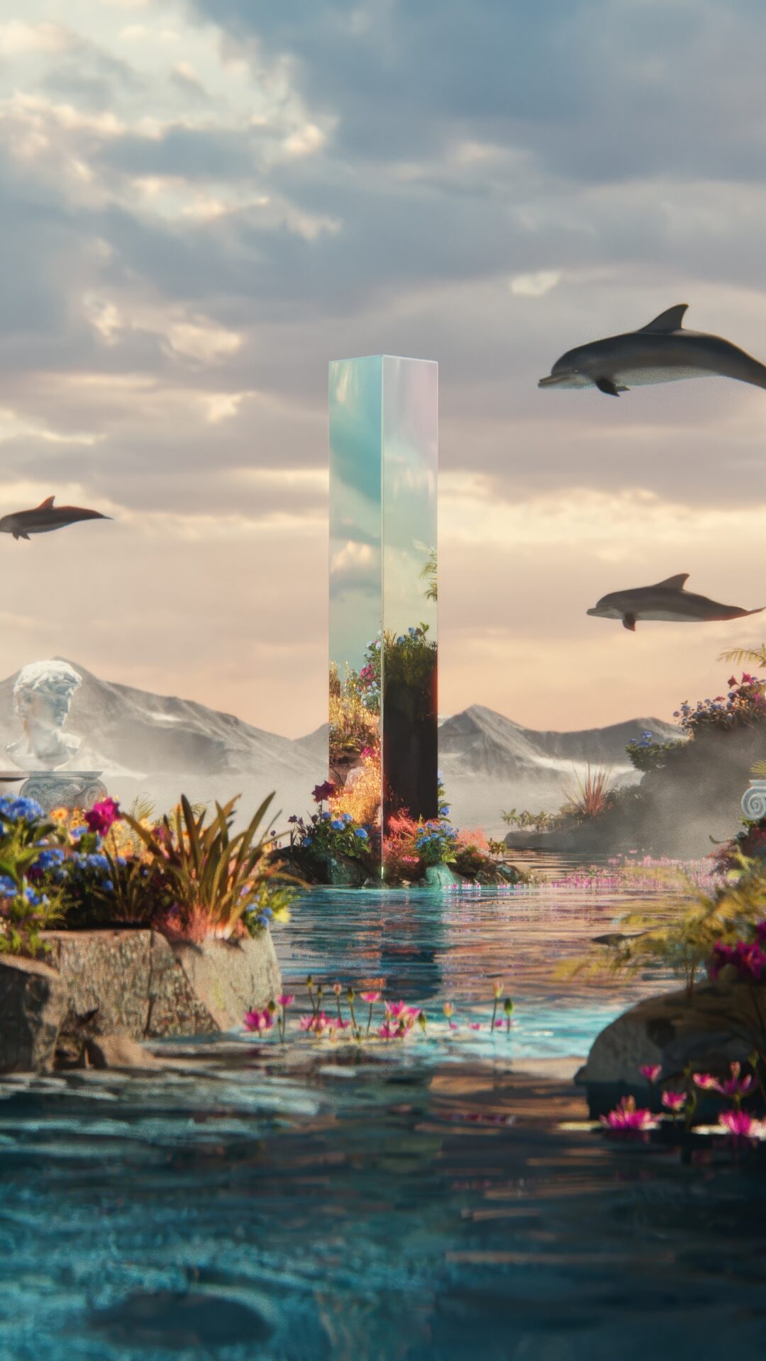 A calm canal flows between stone ruins and flowering banks, with several dolphins leaping from the water. Soft, diffused light creates a gen…