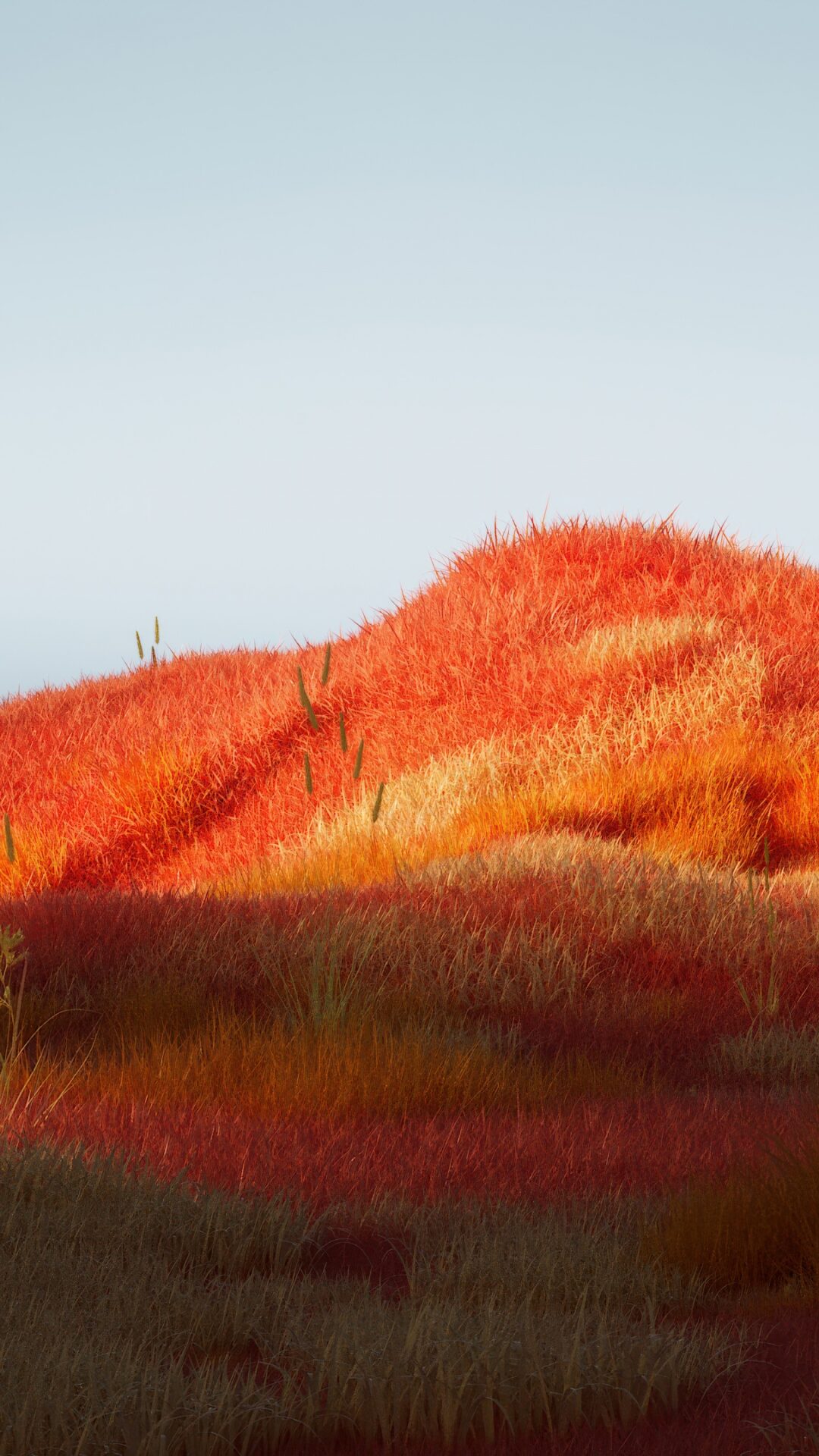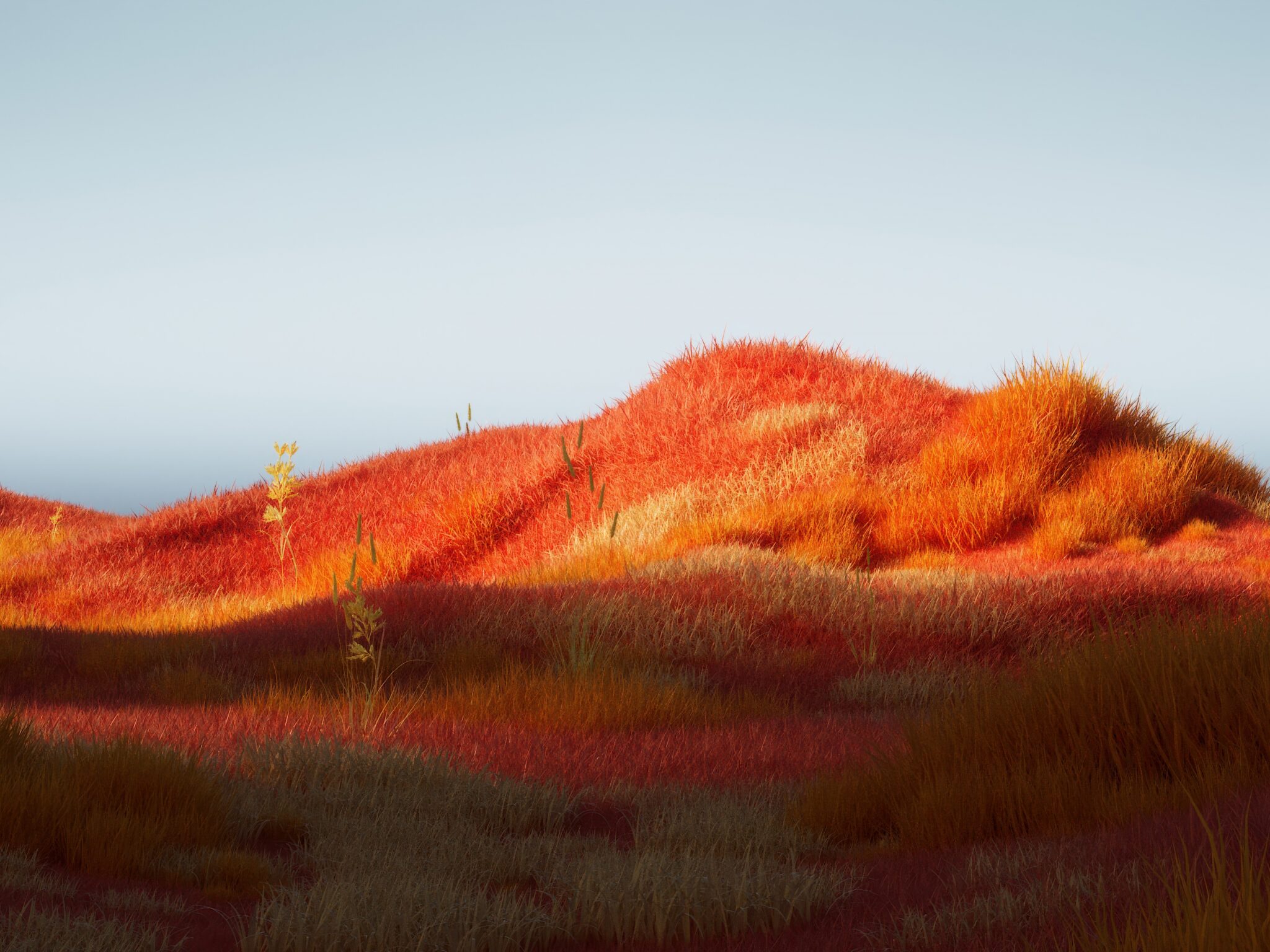 Vibrant orange and red grasses create rolling hills against a pale sky, with darker vegetation in the foreground creating natural depth and …