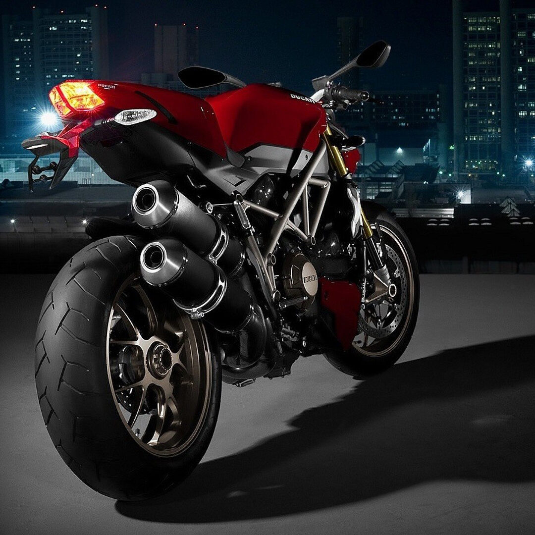A red Ducati sport bike is positioned at a slight angle against a blurred city skyline at night. The polished metal of the exhaust pipes and