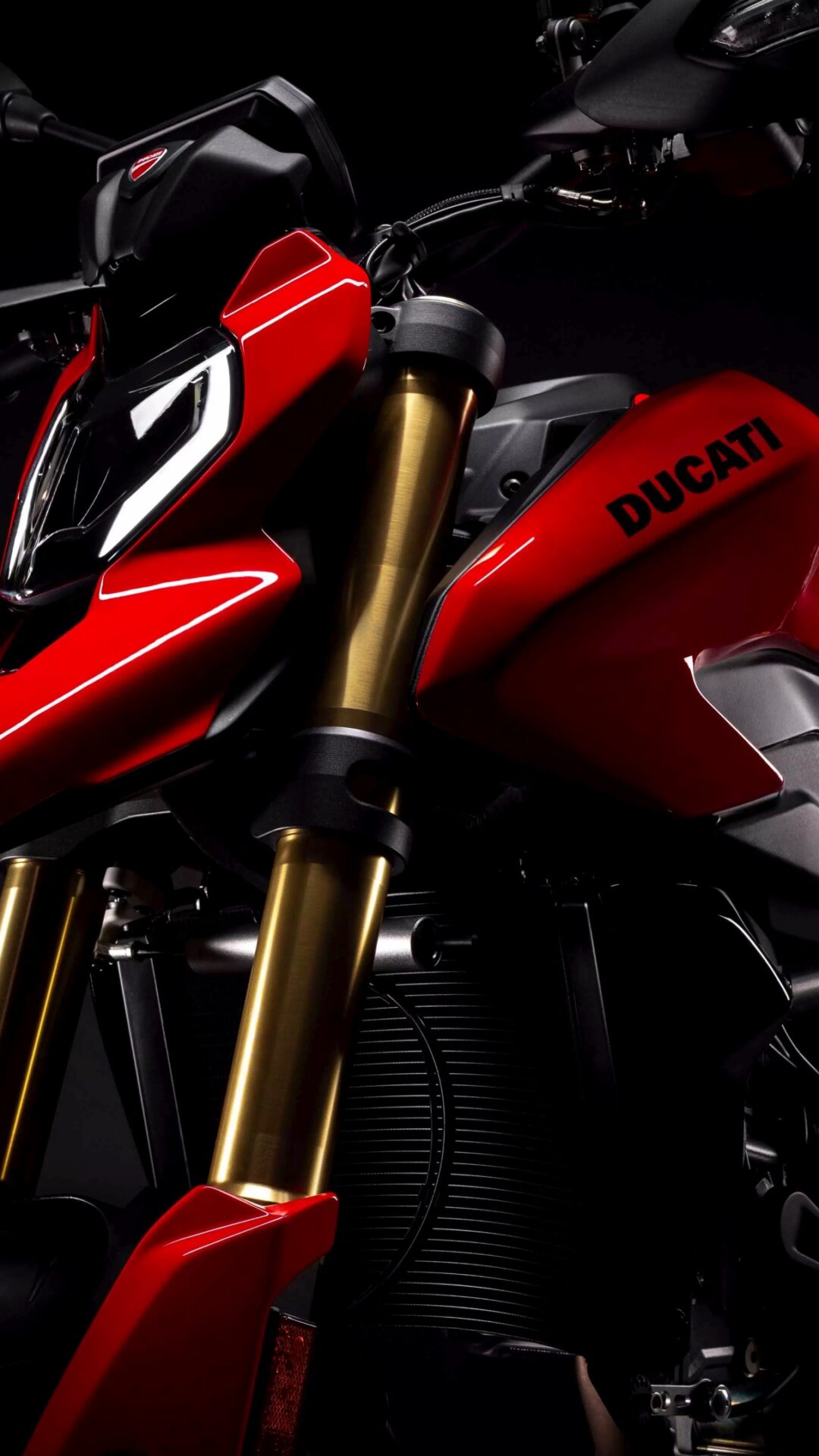 A red Ducati Streetfighter V4 motorcycle is angled against a dark background. Glossy red paint highlights the bike's curves, contrasting with matte black and golden forks.
