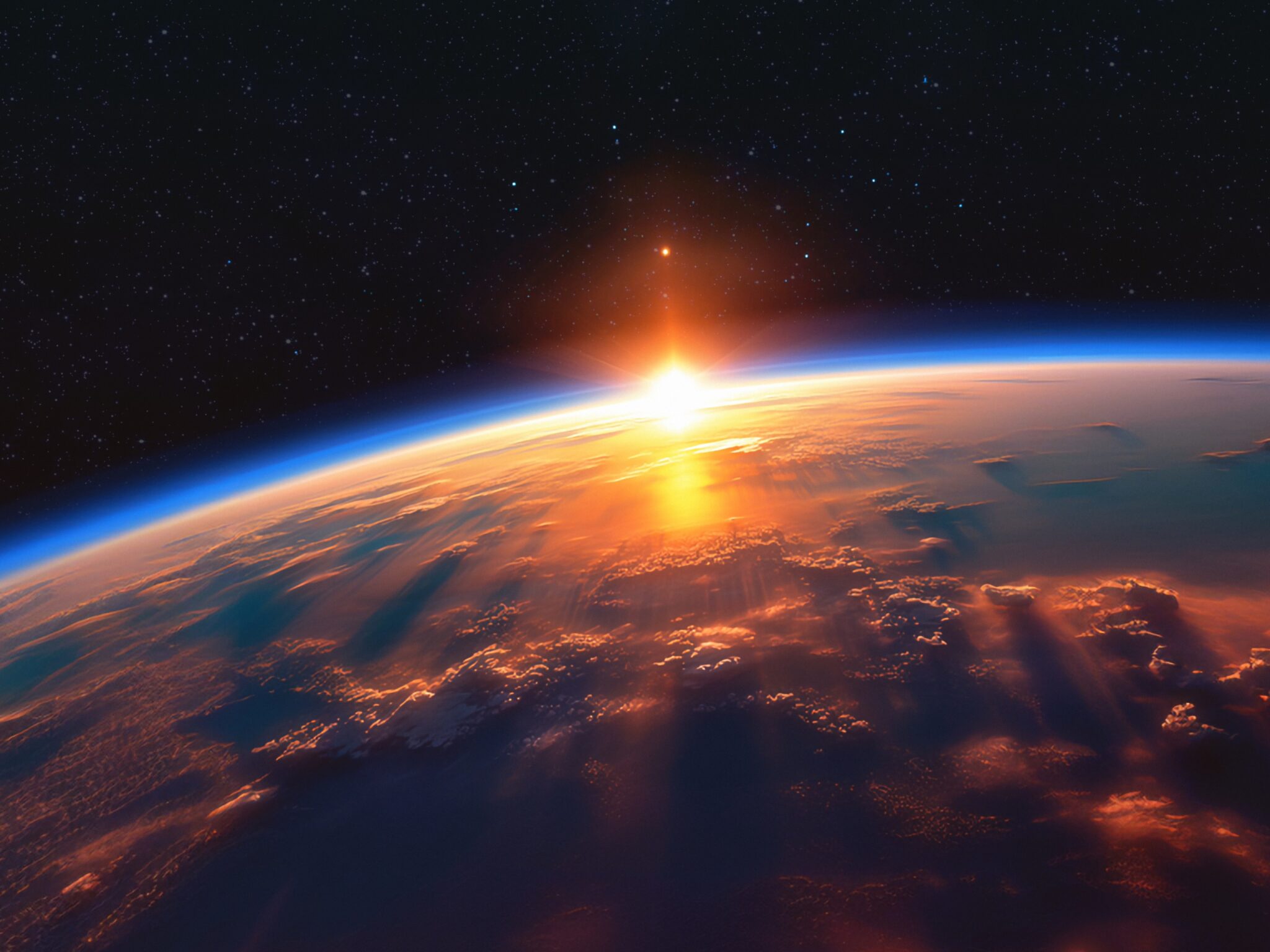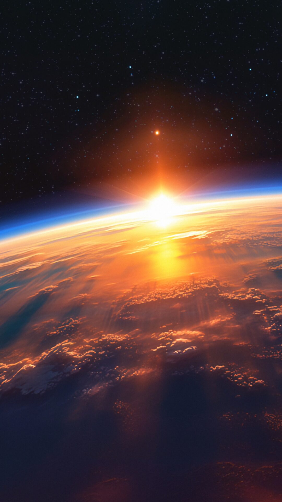 Earth glows with warm orange and golden light as the sun rises over its curved horizon, while a brilliant blue atmosphere frames the planet …