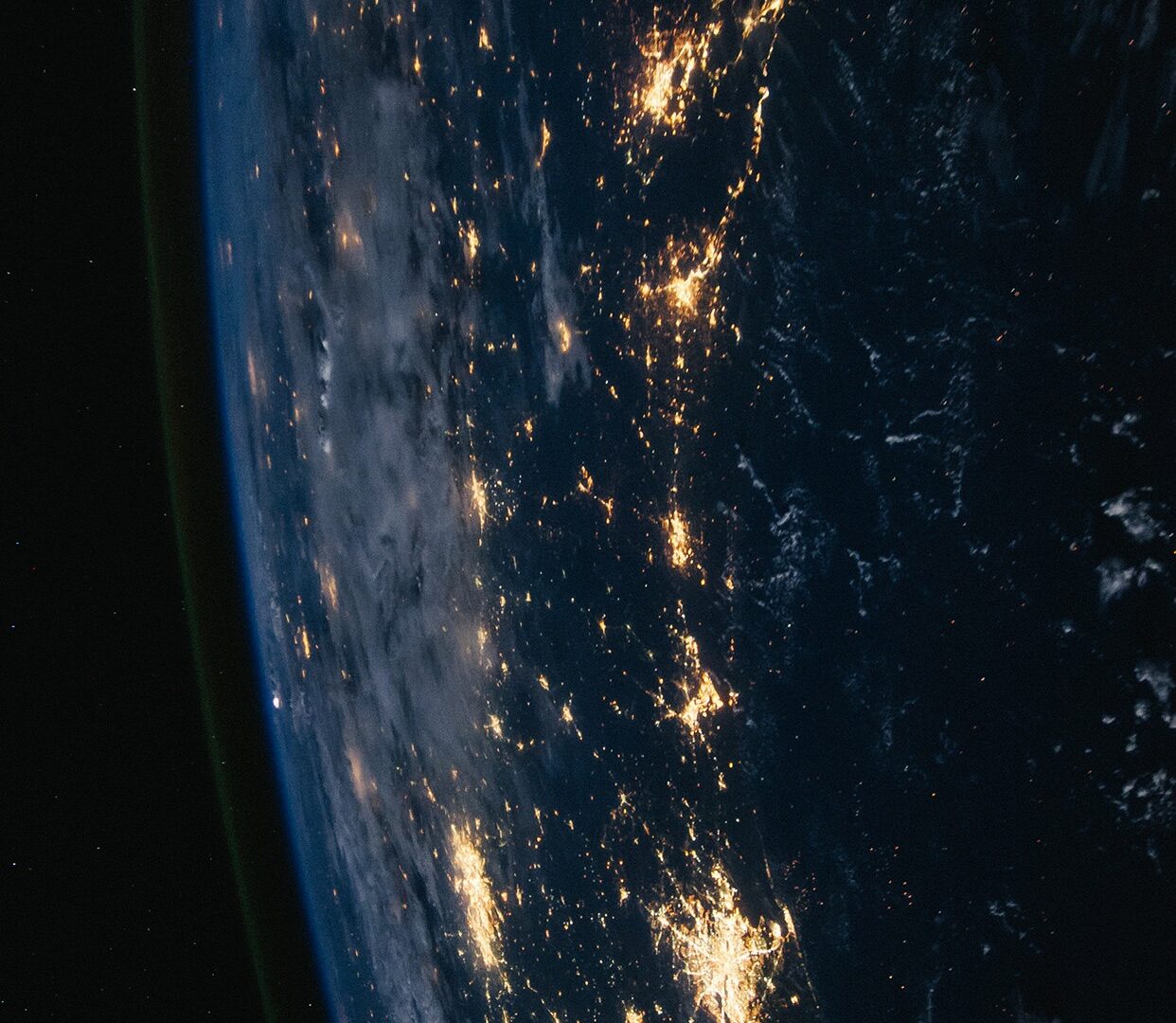 Earth glows below the ISS, its coastlines and cities traced in golden light against the deep black of the ocean. The curvature of the planet