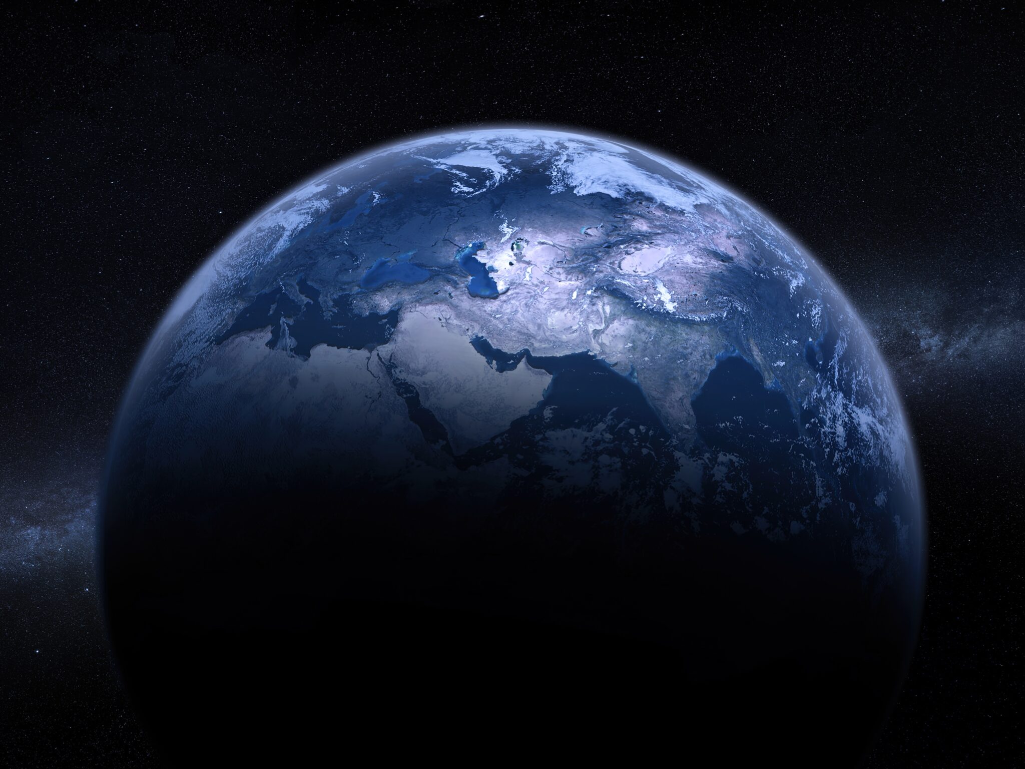 Earth floats majestically in deep space with brilliant blue oceans and purple-tinted continents illuminated against the star-filled darkness…